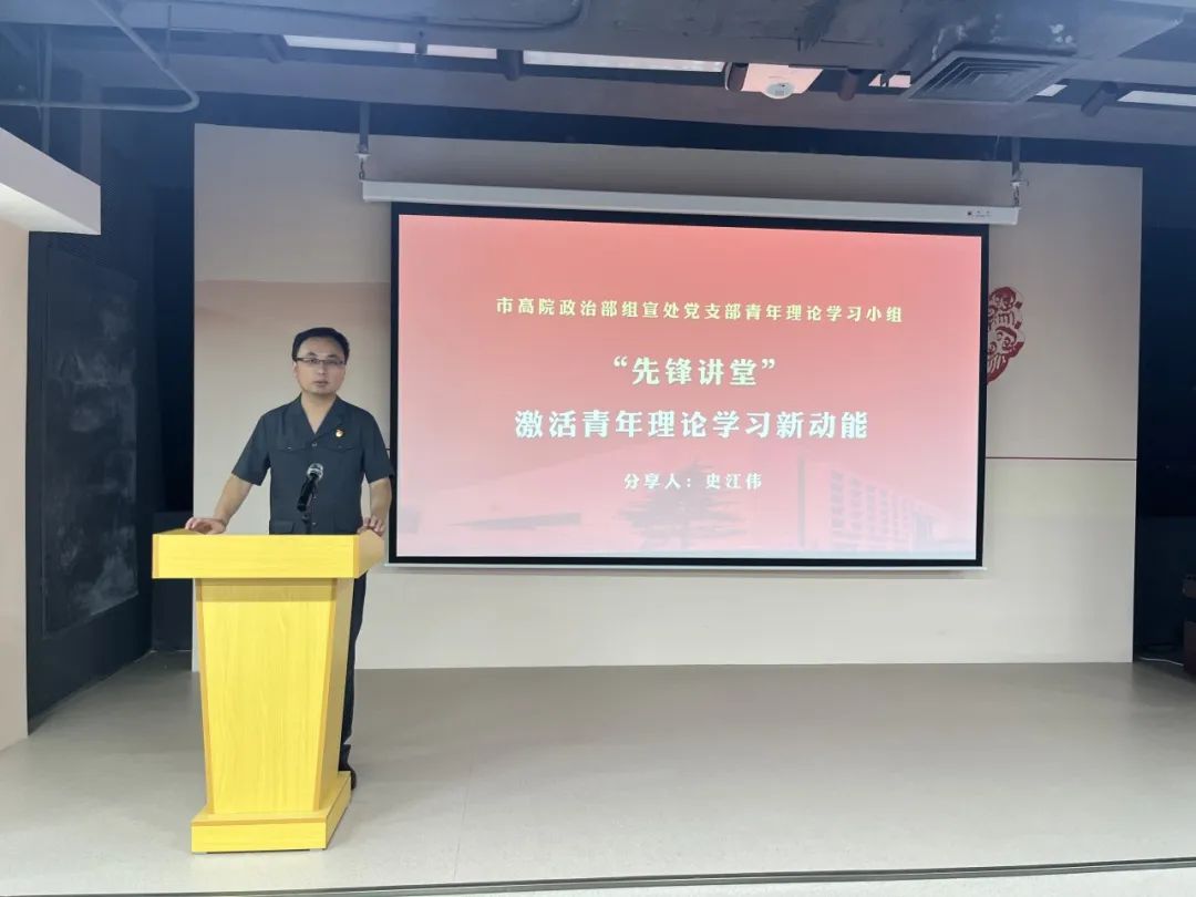 北京高院组宣处党支部青年理论学习小组组长史江伟同志分享了支部发挥“学习先锋”青年理论学习品牌作用,用讲堂“解惑”“解渴”“走心”“鼓劲”,有效激活青年理论学习动能,推动部门工作高质量发展的实践。