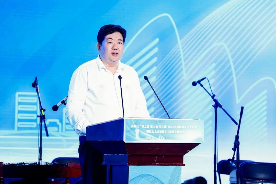孙硕在致辞中表示,从历史走来,深厚的文化底蕴赋予了西城独特的魅力。作为营城建都肇始之地、中国大运河世界遗产北端点、首都功能核心区和全国文化中心的核心承载区,西城有着浓郁的文化氛围、活跃的文化交融。这里一砖一瓦都是文化,城墙街巷皆有故事,古朴雄浑的蓟城纪念柱让我们深刻感受着老城千年文化韵味,高大雄伟的北京建都纪念阙向人们展示着金中都大安殿曾经的辉煌,让人们能够在寻根追忆中感受历史的厚重。蓄今朝之势,坚定的文化传承树起了西城鲜明的标识。近年来,西城区坚持以强烈的政治责任感和历史使命感,扎实推动全国文化中心功能建设,弘扬红色文化,创新文物建筑活化利用模式,建设“书香西城”,文化魅力进一步彰显。坚持打造“自信的文化育文明”新时代文明实践品牌,以文化赋能常态化创城,连续六届蝉联“全国文明城区”荣誉称号。坚持深入走好群众路线,有效盘活区域资源,动员居民群众、社会机构等多方力量参与到各类文明实践活动中。坚持推动以“1卡1园8驿站”为核心内容的“文明西城118战略”落地,感受西城温度与回馈,在传承弘扬中凝聚最广泛的力量。向未来出发,光荣的文化使命带给了西城美好的前景。在推进中华民族伟大复兴、推动新时代首都发展的新征程上,西城区努力建设着服务高效、发展高端、治理精细、开放包容、宜居宜业的高品质之城,奋力谱写着中国式现代化实践的崭新篇章。以纪念建都870周年活动为契机,贯通历史、当下和未来,精心擦亮历史文化名城金名片,传承和弘扬好中华优秀传统文化。不断提升西城文化影响力、感召力,培育文化品牌,提升文化服务,激活文化资源,探索文化事业和文化产业贯通发展的新模式,不断满足市民群众对美好生活的需要,让西城成为文艺精品荟萃、文化魅力彰显的厚重之城。