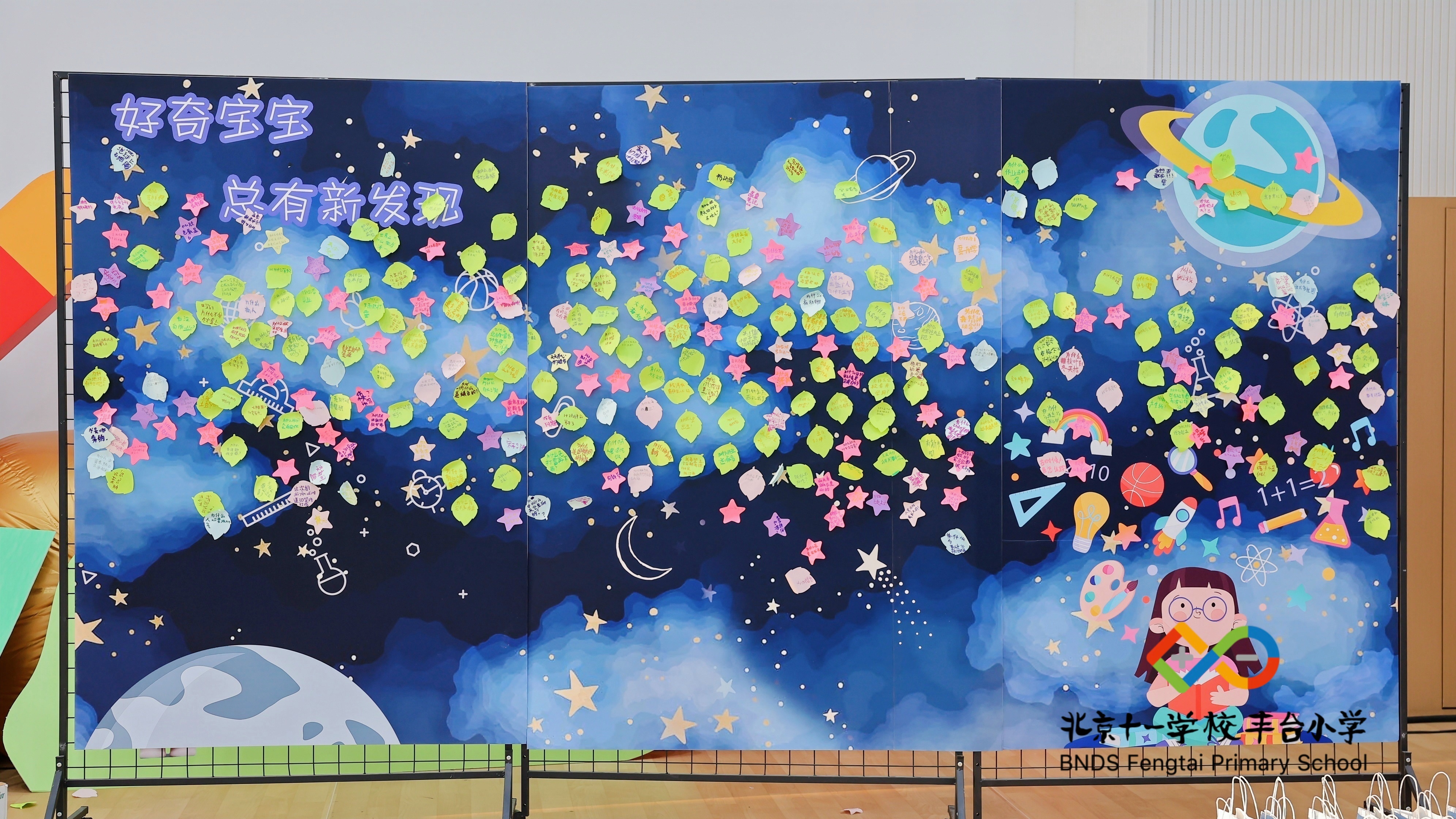 开学日当天,同学们展示了他们的实验成果,形成了一个互动学习区,各个家庭实验室向来校的同学们展示了自己的研究成果。参与互动的同学,在好奇墙上写满了自己的好奇问题。