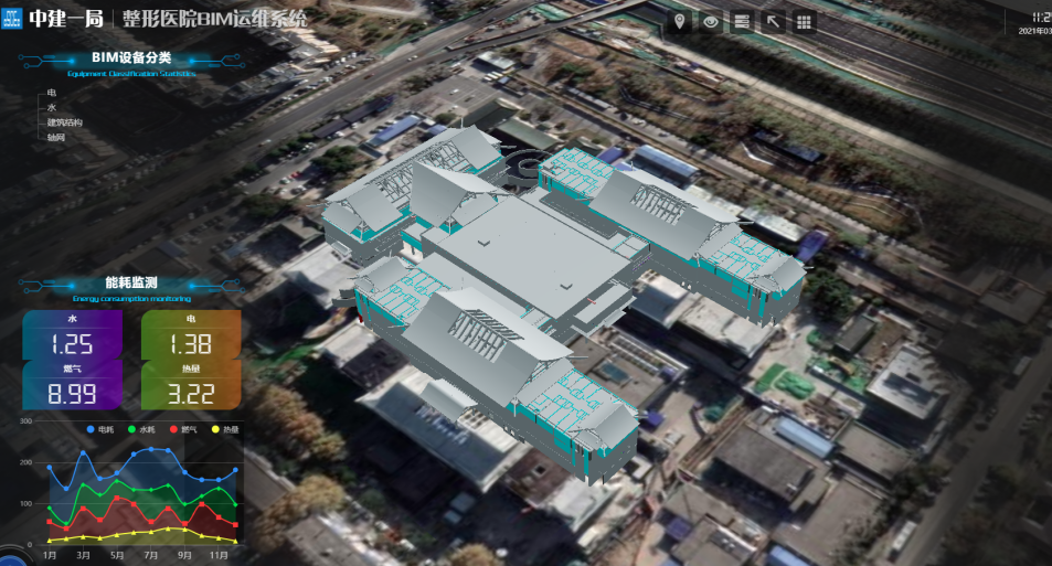 中建一局秉承先锋文化,借助大数据、云计算、人工智能、5G等新技术,持续推进智慧城市建设,以石景山区中国医学科学院整形外科医院改扩建工程(Ⅰ期)项目为载体,搭建智慧运维系统。