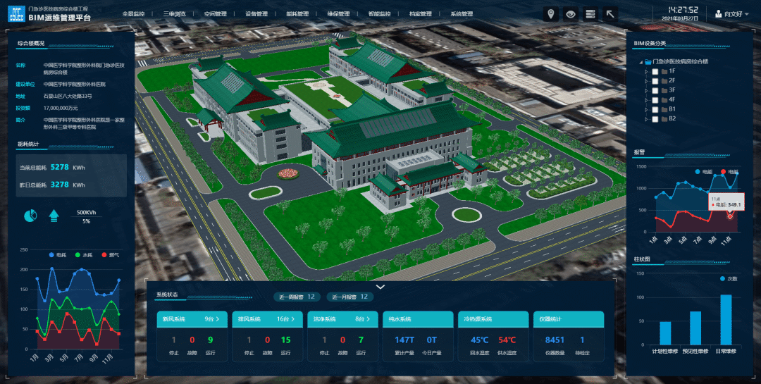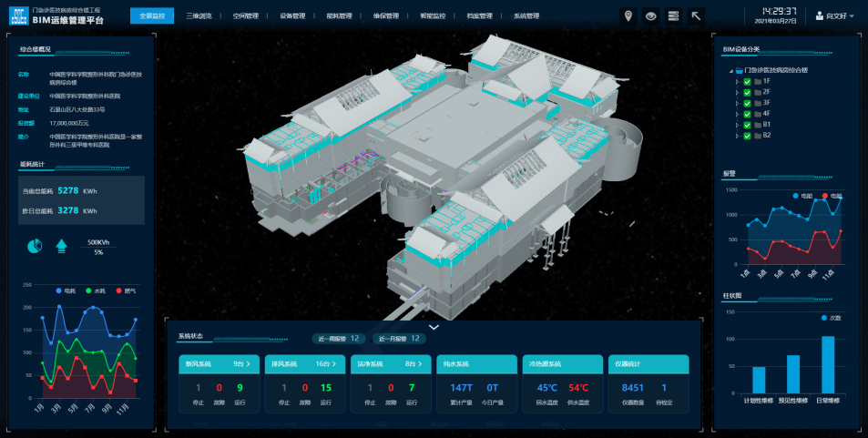 传统医院信息化分散,难以高效的处理医院项目所承载的海量且散乱的人、物和事件等信息流,通过搭建BIM运维管理平台,可以集中收集散乱的数据,理顺海量的信息流,解决了传统运维信息孤岛、决策难度大等问题,实现基于BIM可视化的快速故障定位、排查、多业务信息数据集成、能耗分析监控等,有效确保业务稳定运行,为快速运维决策提供准确、实时数据。
