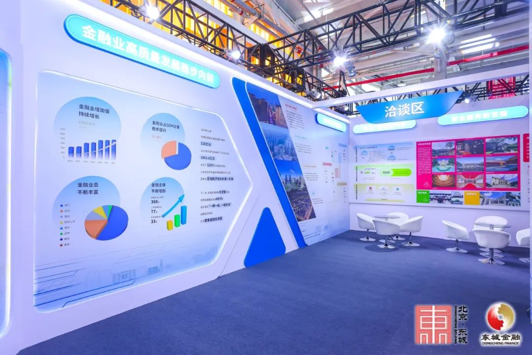 在金融服务专题展东城展区,东城区以“新动能 新活力 新未来”为主题,向观众展示东城金融业整体发展情况、成果以及战略规划。通过数字沙盘、数字人民币场景应用、视频等方式,从东城金融阔步新征程、金融集聚新高地、空间集聚新格局、“两区”建设新气象、金融赋能新面貌、紫金服务新发展六个主题板块,全景呈现东城区金融产业发展成果,让观众全方位感受到东城金融的蓬勃生机。