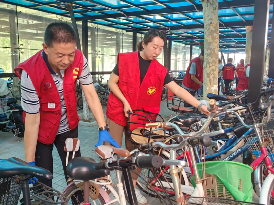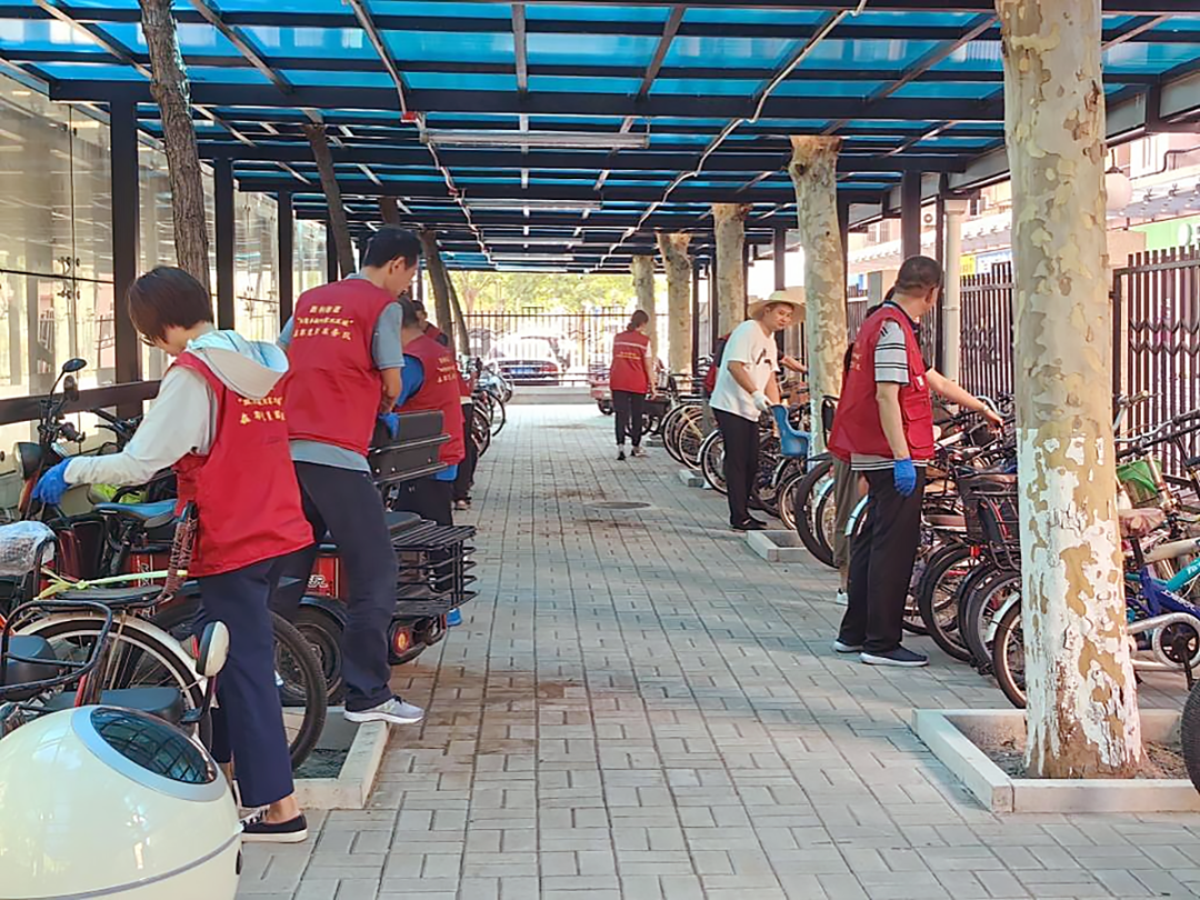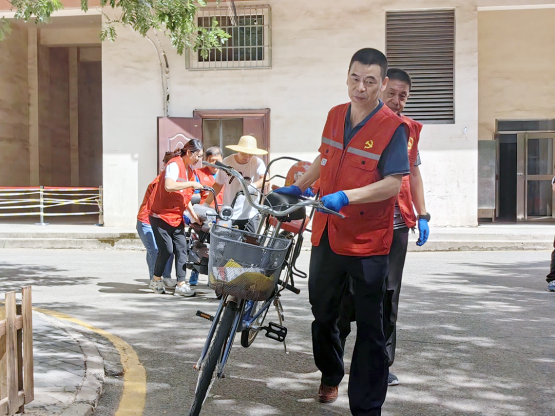 社区工作者和共建单位党员干部帮助居民把自行车搬进新车棚。