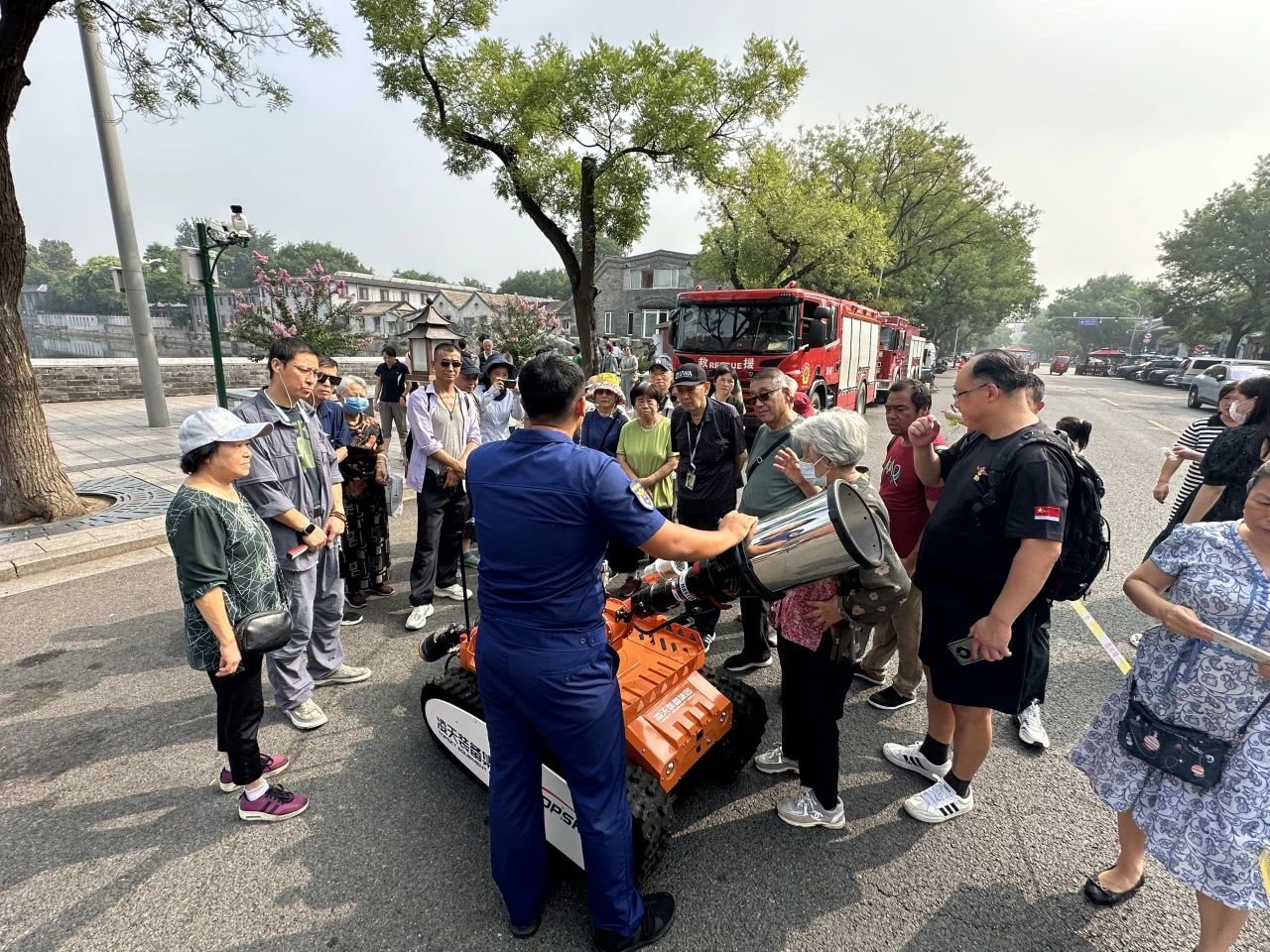 在消防员的组织、解说下,居民近距离参观并熟悉了消防车、消防水炮、消防机器人等消防设备。