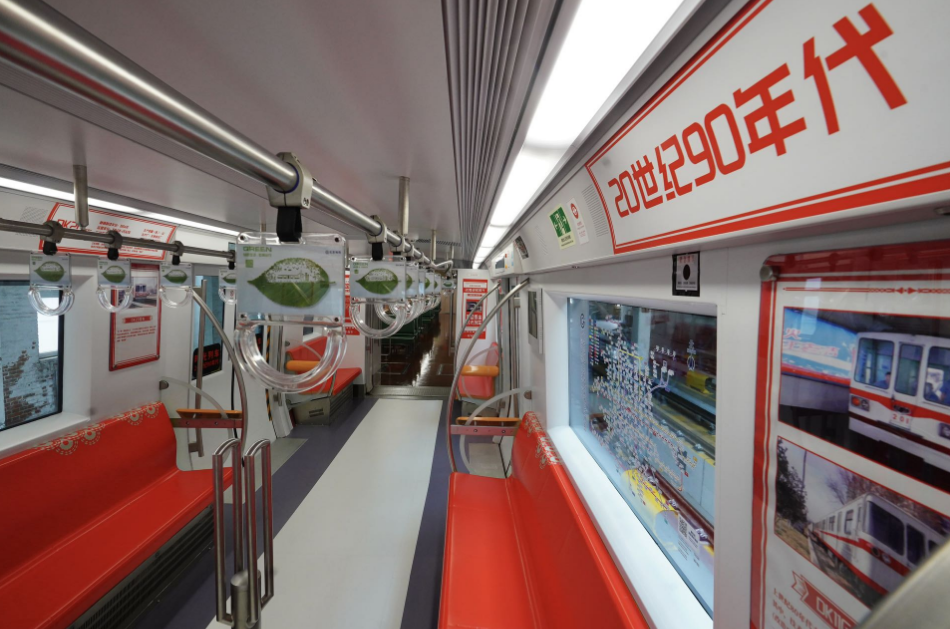 一下就把人带回了上世纪六七十年代。往中部车厢走,经典红色座椅、90年代的线路图、白蓝色的“双奥”元素车厢、能放视频的智慧车窗都吸引着乘客好奇的目光。