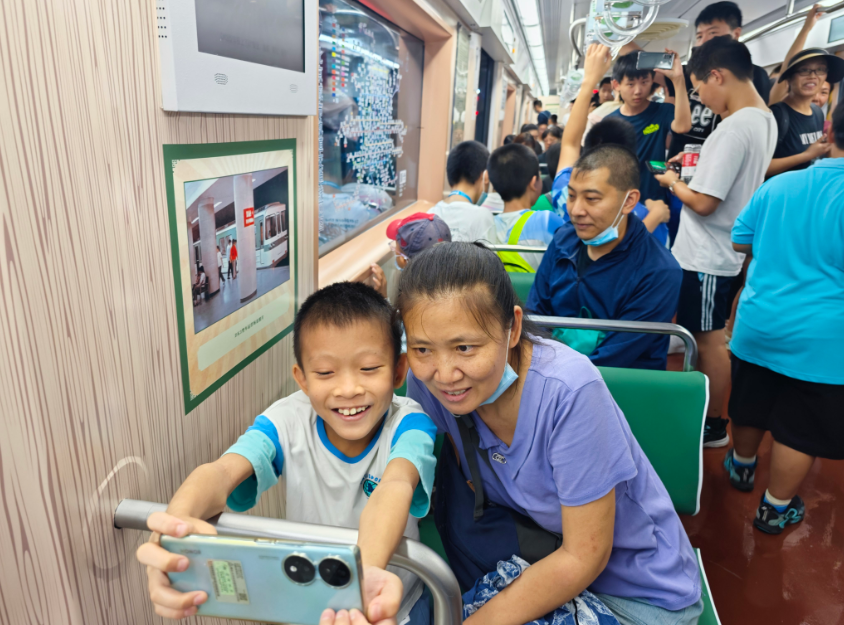 8月15日,地铁复兴门站,市民对时光列车拍照留念