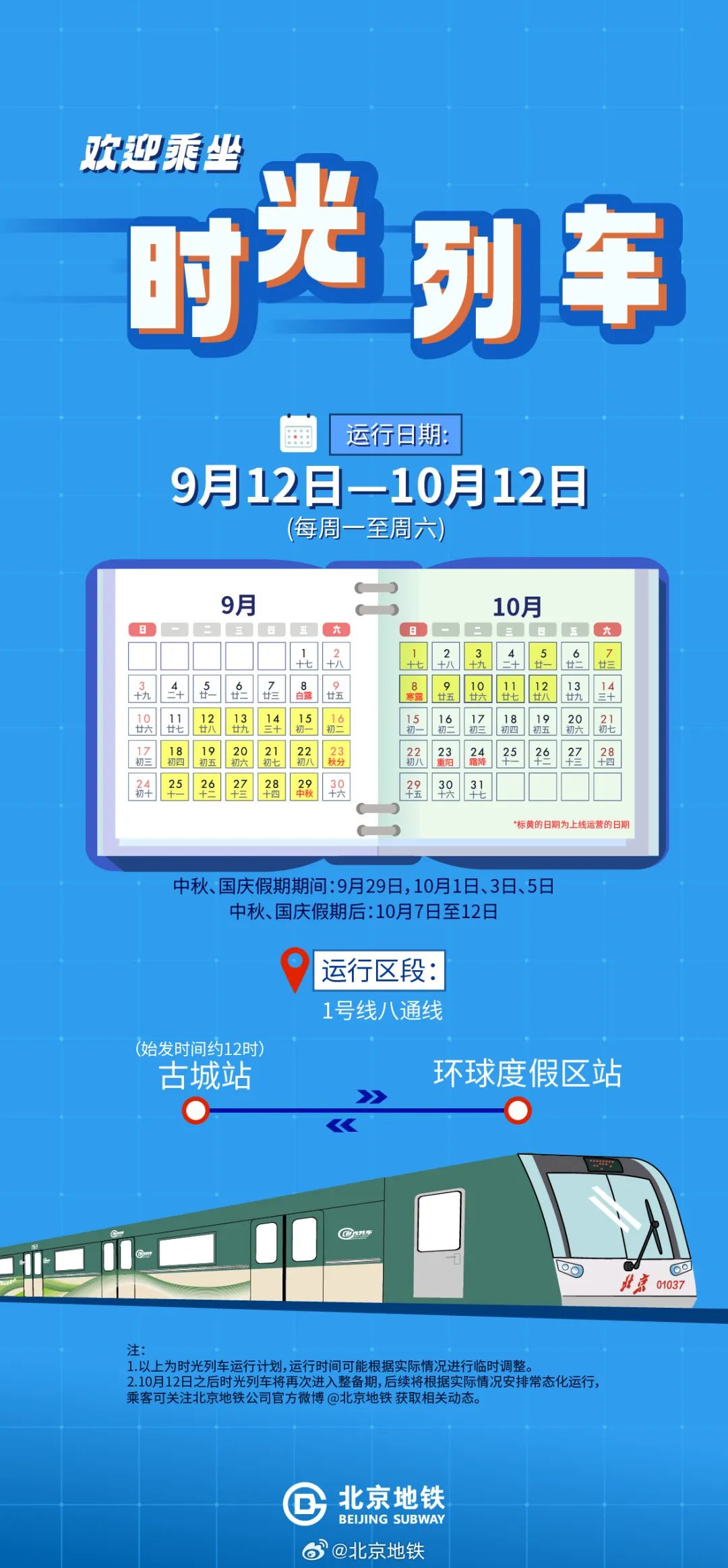 逢单日运行;假期后,列车将在10月7日至12日运行,运营时间可能根据实际情况进行临时调整。