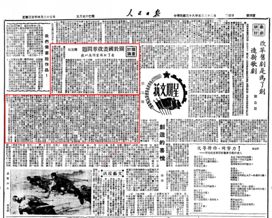 ▲文物说明:1949年5月22日,刊载蔡若虹《关于国画改革问题——国画讨论之一》等报道的《人民日报》(香山革命纪念馆藏)。