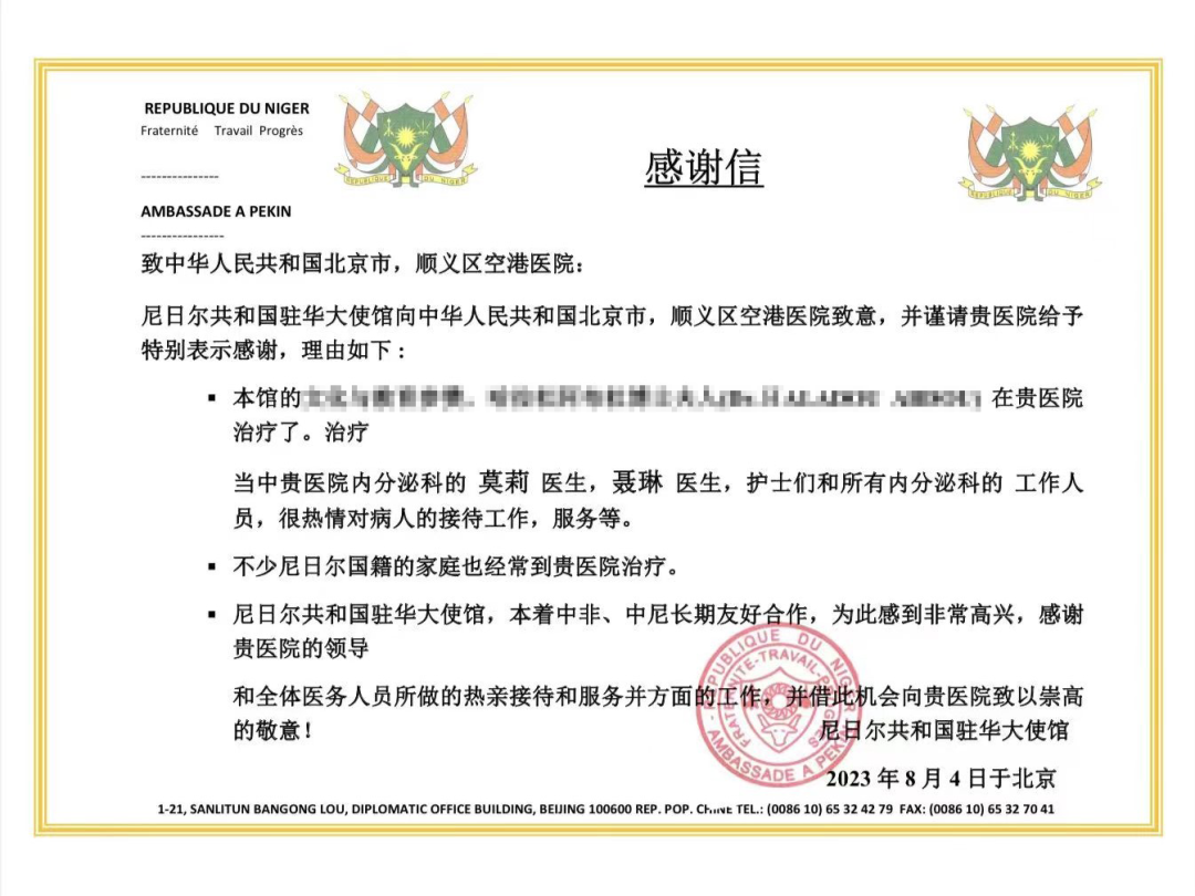 尼日尔共和国驻华大使馆向空港医院发来的感谢信。