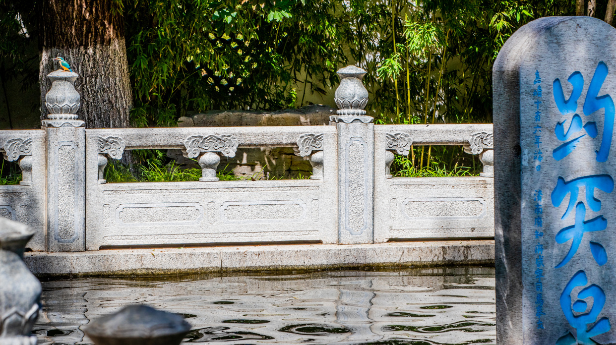 趵突泉旁翠鸟忙,闽园睡莲连成行。记者来到济南园,垂柳下的趵突泉景观喷涌翻滚,字碑上一只正在觅食的翠鸟目光炯炯、伺机而动,待到水中鱼儿冒头,翠鸟瞬时展翅俯冲至水面,不多时小巧的鸟喙便叼着一条通体红色的小鱼,那是它的“战利品”。