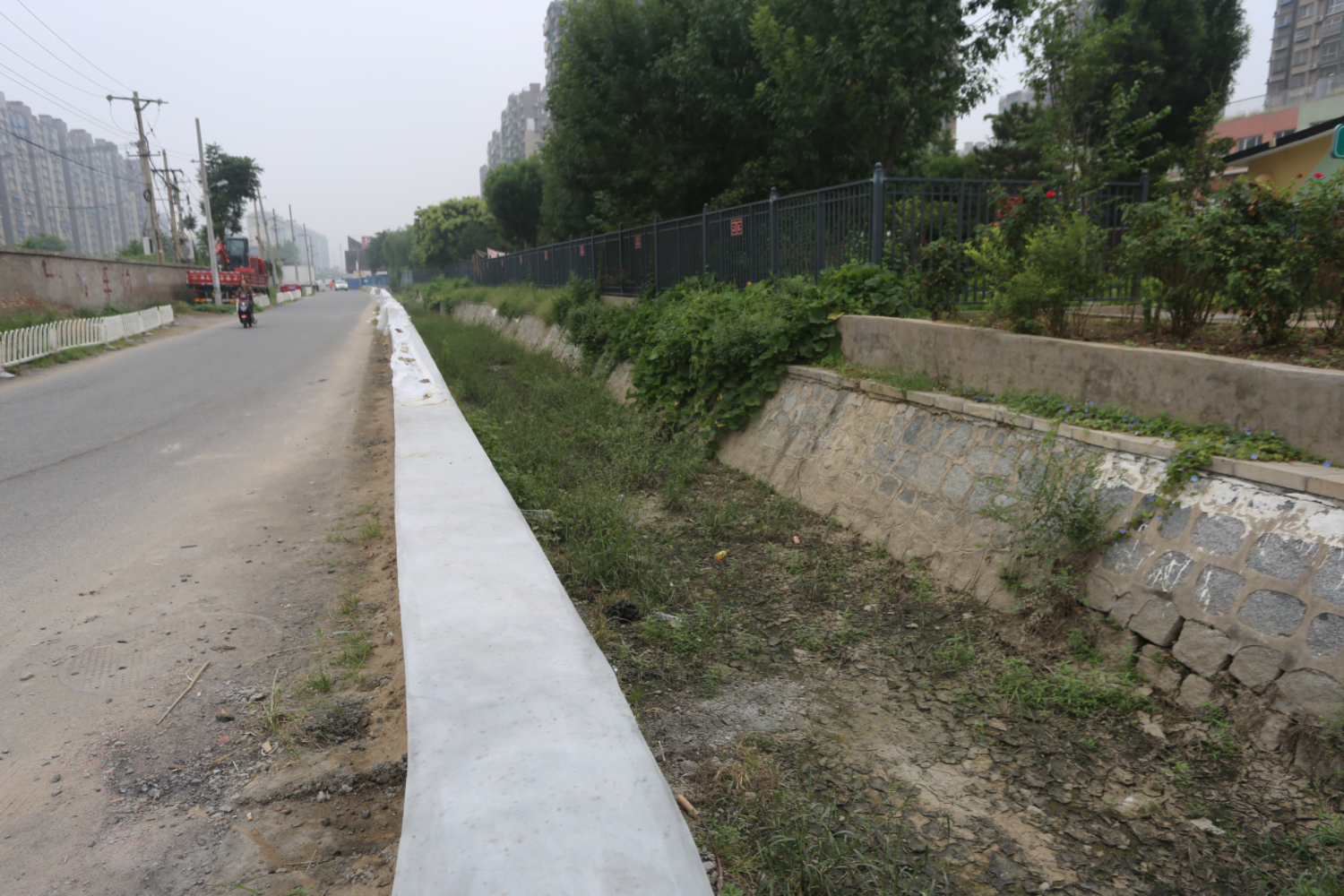 “一边是车道,一边是河道,来往行人夹在中间,总感觉不安全。现在加了一道围挡,走在路上安全多了。”家住丰台南苑街道诚苑中里小区的居民谷贵锁指着西南沟南侧新砌的围挡墙由衷地说。