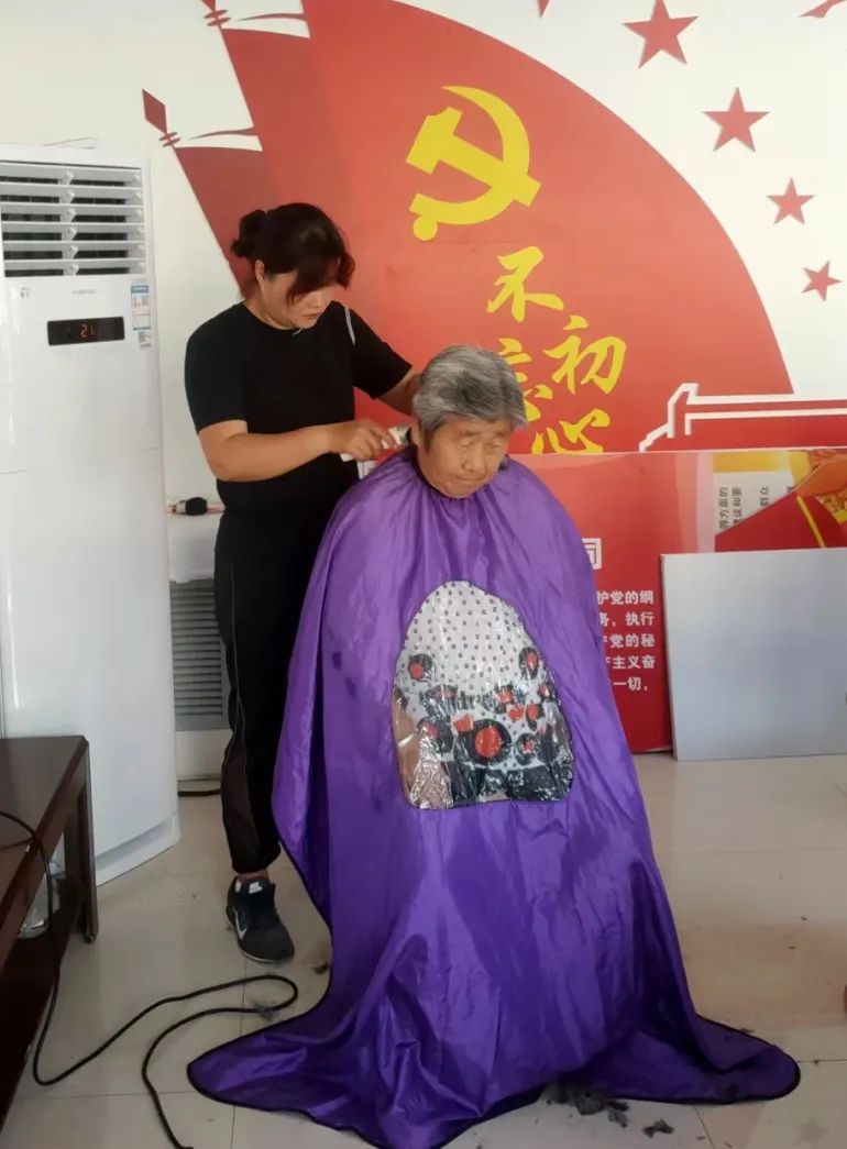 每到理发日,以村支部党员、网格员和志愿者们成立的志愿服务队都会早早地来到娱乐大厅内,摆好座椅,收拾好场地,等待村民们来理发。