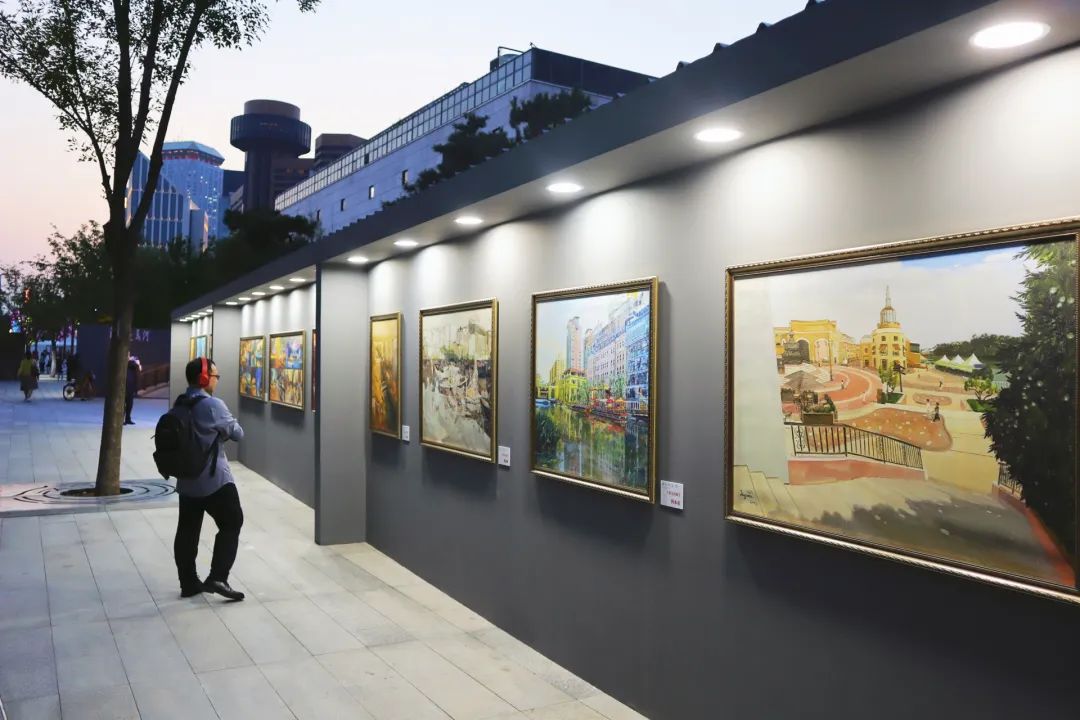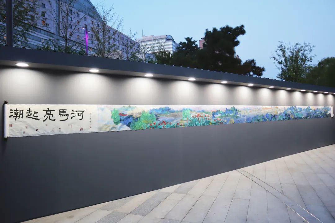 美术展区共展出46幅美术作品,其中包括由多位美术家历时3个月精心绘制的美术长卷《潮起亮马河》(总长12米),整幅作品以中国画特有的绘画语言将亮马河沿岸的城市风情、历史底蕴和现代光彩串联起来,生动展现繁华璀璨的河畔风光。走进美术展区,一幅幅色彩丰富的艺术作品将灿烂多姿的河畔美景和现代化都市风情生动呈现,感受“朝阳式浪漫”。