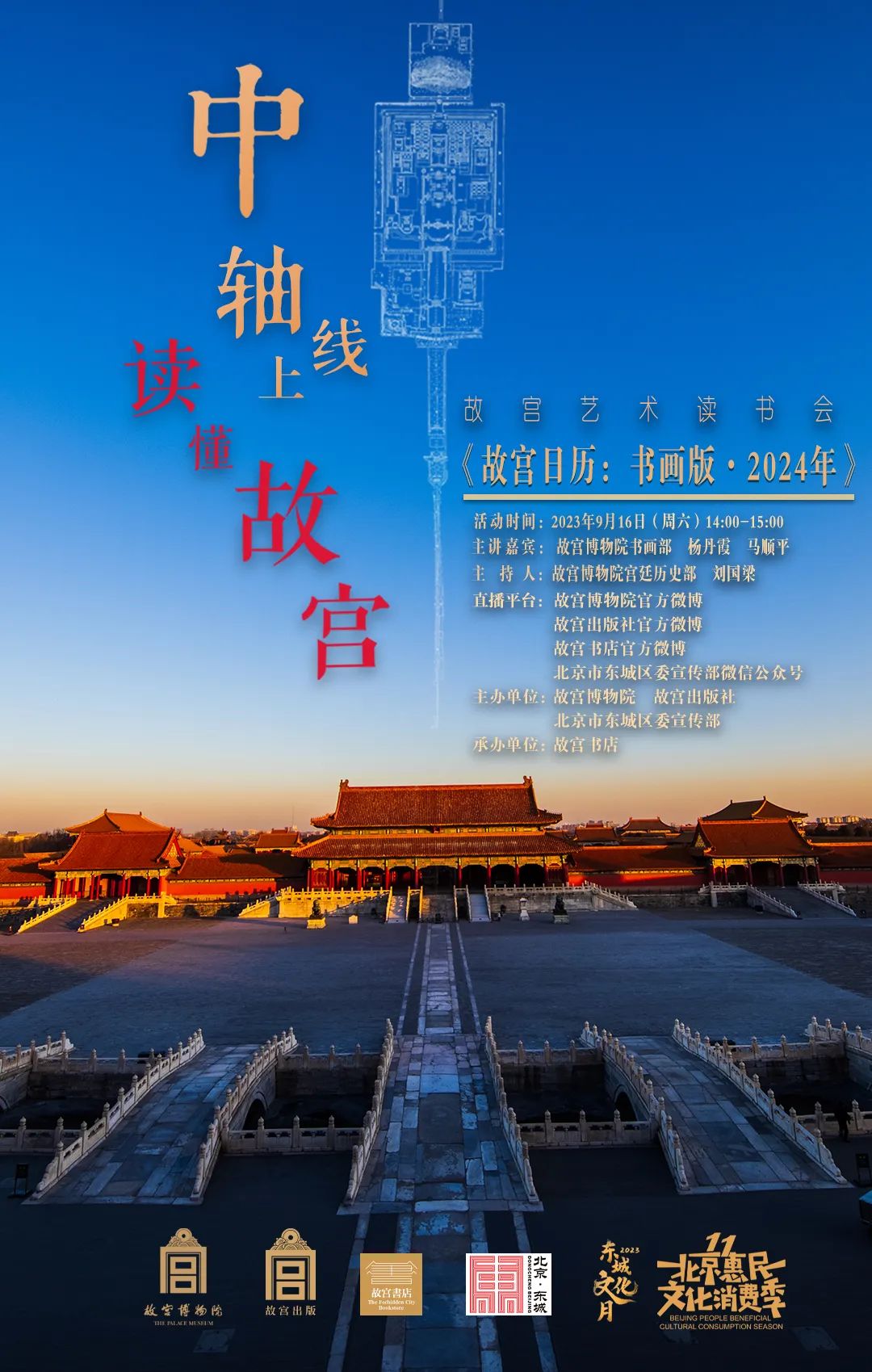 9月16日下午,中共北京市东城区委宣传部与故宫博物院、故宫出版社联合主办的“中轴线上 读懂故宫”之《故宫日历:书画版·2024年》公益读书直播活动如约而至。此次活动作为“中轴线上 读懂故宫”故宫艺术公开课公益活动2023年第十三讲,邀请了故宫博物院书画部杨丹霞、马顺平两位老师,为大家带来故宫日历撰稿及制作背后的精彩故事。活动同时在故宫博物院、故宫出版社、故宫书店等多个官方微博进行网上直播,当天近80余万人在线观看,一个小时的直播为广大观众带来一段精彩极致的文化之旅。