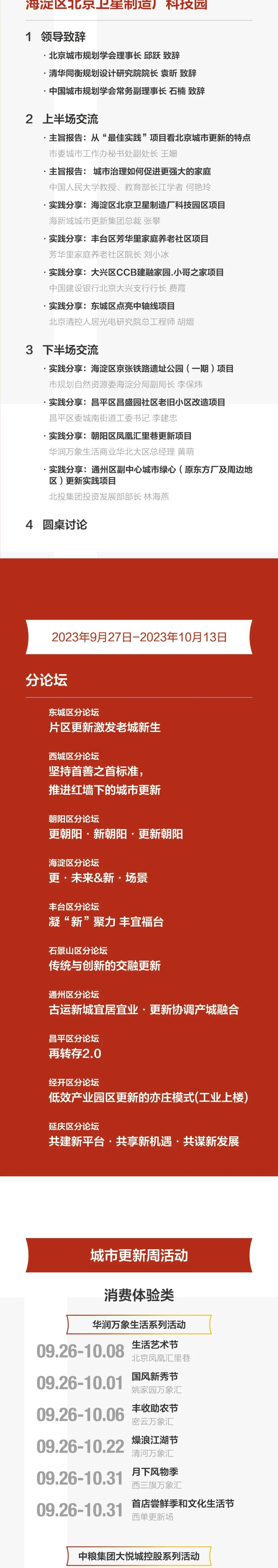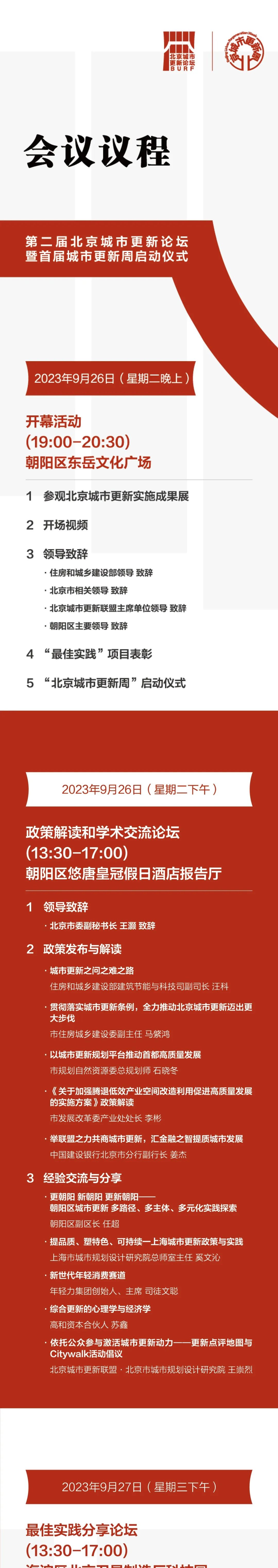 第二部分为论坛交流活动。政策解读与学术交流论坛围绕“聚力·更新”主题开展政策宣讲、行业专家学术分享、京沪两地实践交流;最佳实践分享论坛围绕“看见·价值”邀请行业专家、深度参与更新实施的多元主体开展经验分享、对话研讨。此外还将有10个区级分论坛,突出政企对接、实践交流,推动开拓北京城市更新事业,营造全社会共建共享的良好氛围。