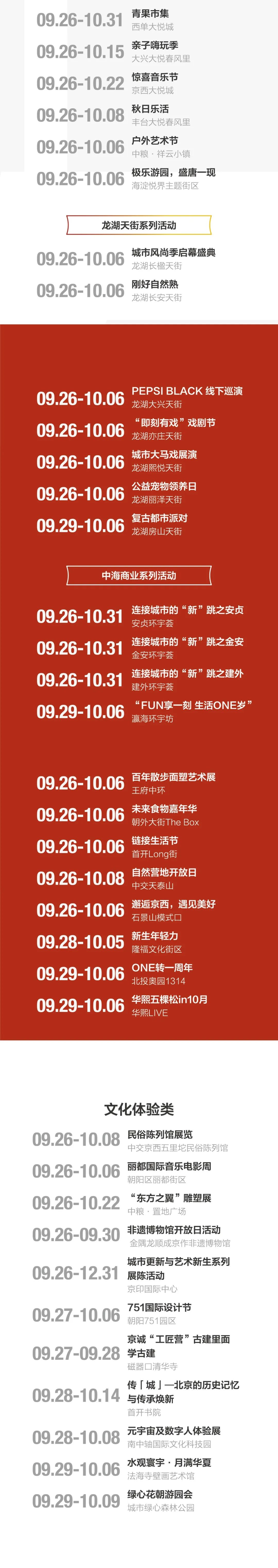 第三部分为首届北京城市更新周。自9月26日起至10月14日期间,将以北京城市更新的重点片区、典型项目为场景,举办形式多样的商业消费、文化体验、休闲游憩、参观交流等现场活动。期间还可在“建行生活”APP平台上参与“点亮城市更新地图”打卡兑礼等促消费活动。欢迎广大市民一起走进城市更新场景,共同体验美好的更新。