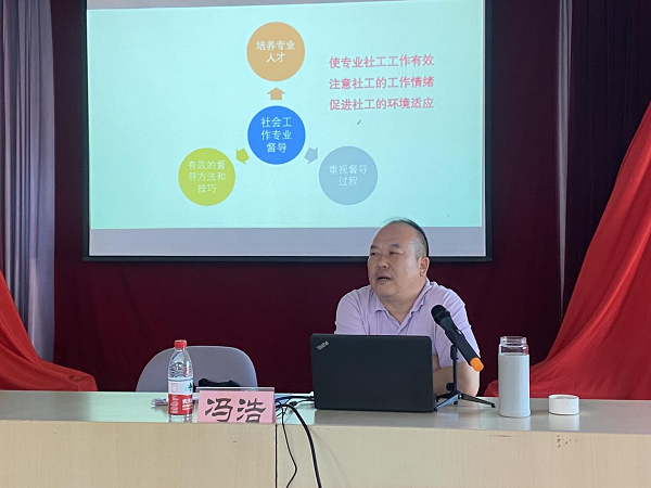 本次培训采取线下线上相结合的方式进行,线下培训在东城区永外东滨河路17号2层会议室,特邀首都经济贸易大学公共事业管理系主任、副教授冯浩老师授课。课上,冯老师从督导的含义、类型、功能、方法、过程、情景模拟六大部分进行讲授,情景模拟中冯老师以学员督导记录为例,就大家不知道督导过程记录怎么撰写方面,从疏解负面情绪、表达正向关怀、梳理工作流程、总结督导成效方面提出4条清晰的写作思路。最后,冯老师建议大家在督导过程中建立良好的督导关系、形成动态的服务,同时强调督导关系的和谐程度将影响受督导者学习效果。