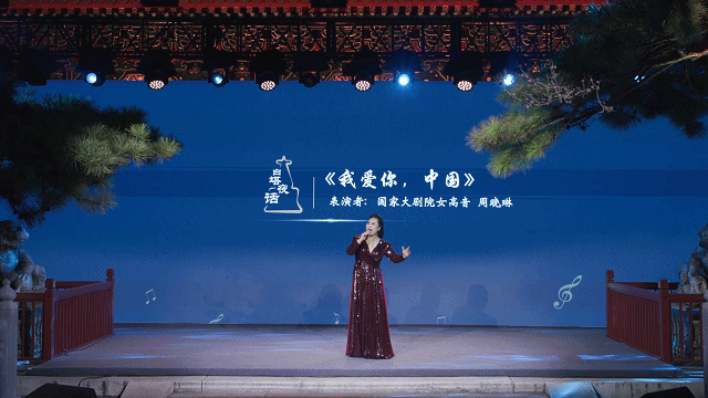 歌颂美丽祖国,由女高音周晓琳带来的歌曲《我爱你,中国》表达了人民对祖国最诚挚的祝愿。