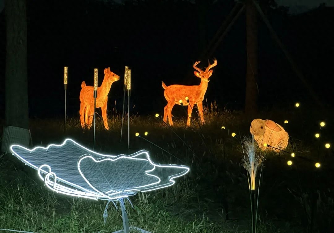 此次夜景灯光分别位于北京冬奥公园莲石湖鸽子广场和火车乐园,以园区树木作为载体进行投影设计,实现物与影的无缝结合,兔子、小鹿、蝴蝶等可爱造型的小品灯具,为大家带来独特的视觉体验。