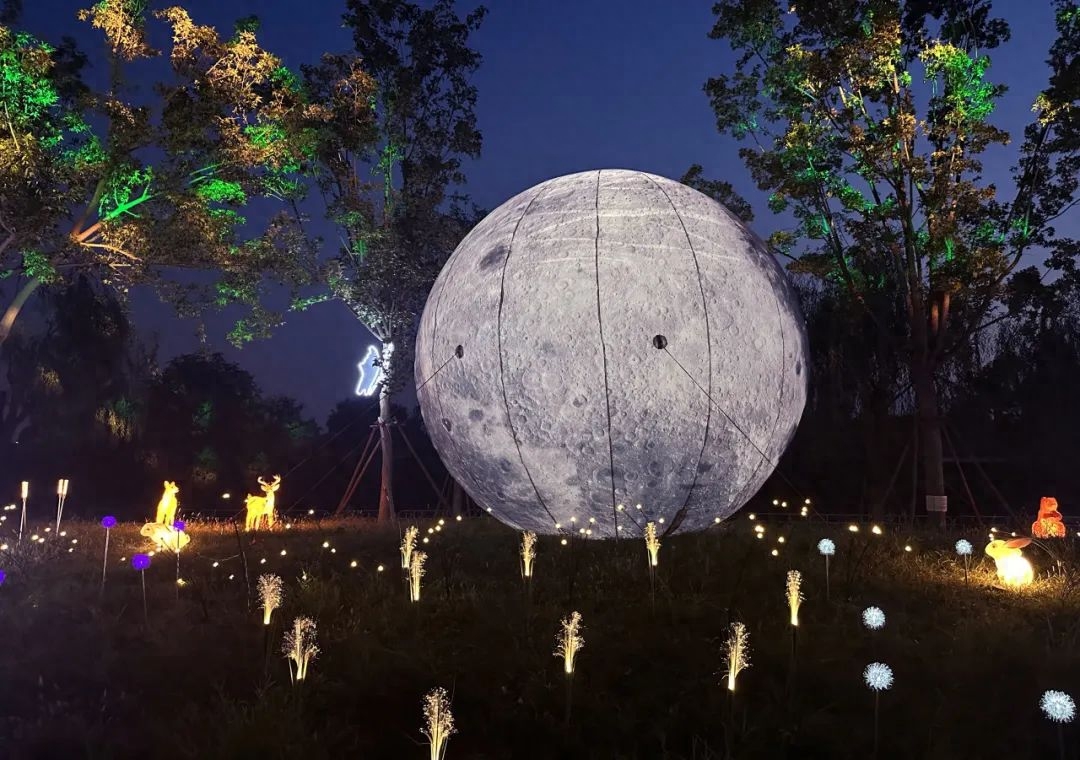 夜幕之下的北京冬奥公园流光溢彩,鸽子广场被限定版“月球灯”点亮。