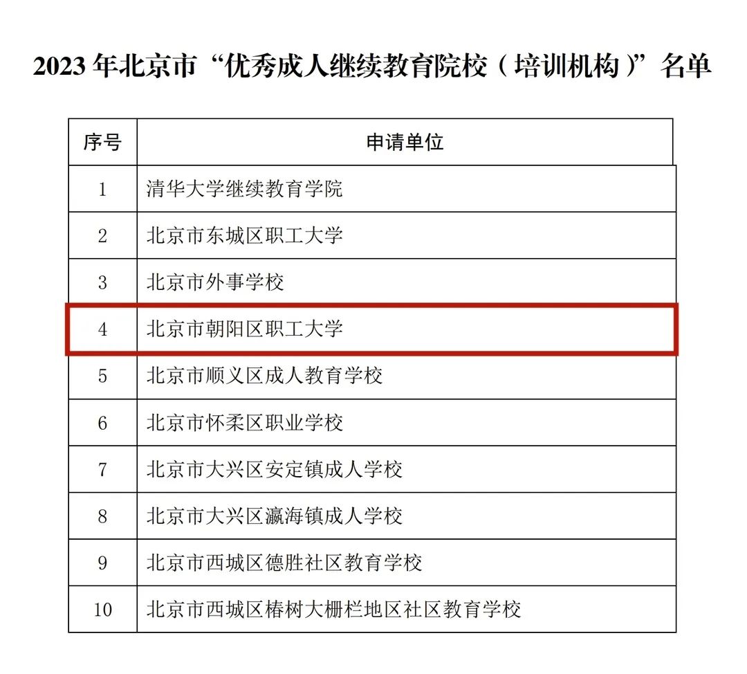 根据教育部关于在“全民学习活动周”期间开展遴选“终身学习品牌项目”和“优秀成人继续教育院校(培训机构)”的精神及北京市第十九届“全民终身学习活动周”的工作要求,北京市成人教育学会组织开展了2023年“优秀成人继续教育院校(培训机构)”遴选工作。经专家评审,朝阳区职工大学(社区学院)被认定为北京市2023年“优秀成人继续教育院校(培训机构)”。