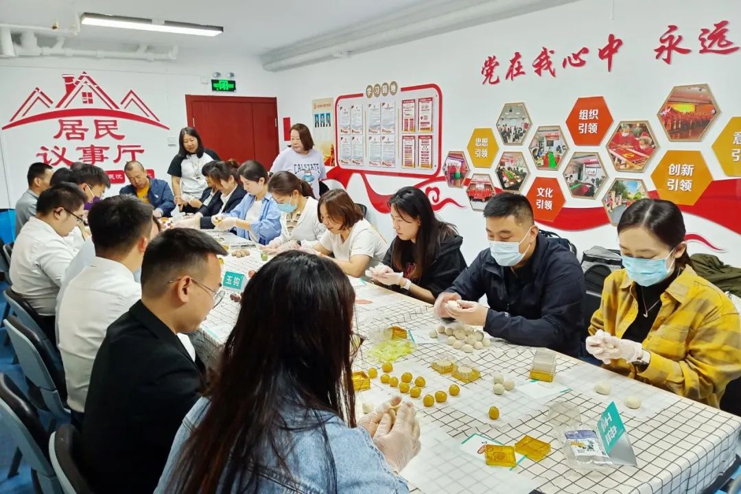 慧忠北里第二社区、安慧北里安园社区组织开展的DIY月饼制作现场,大家称量揉搓面团、擀皮、包馅、压模成型,在欢声笑语中了解传统民俗,增添了浓浓的喜庆气氛。