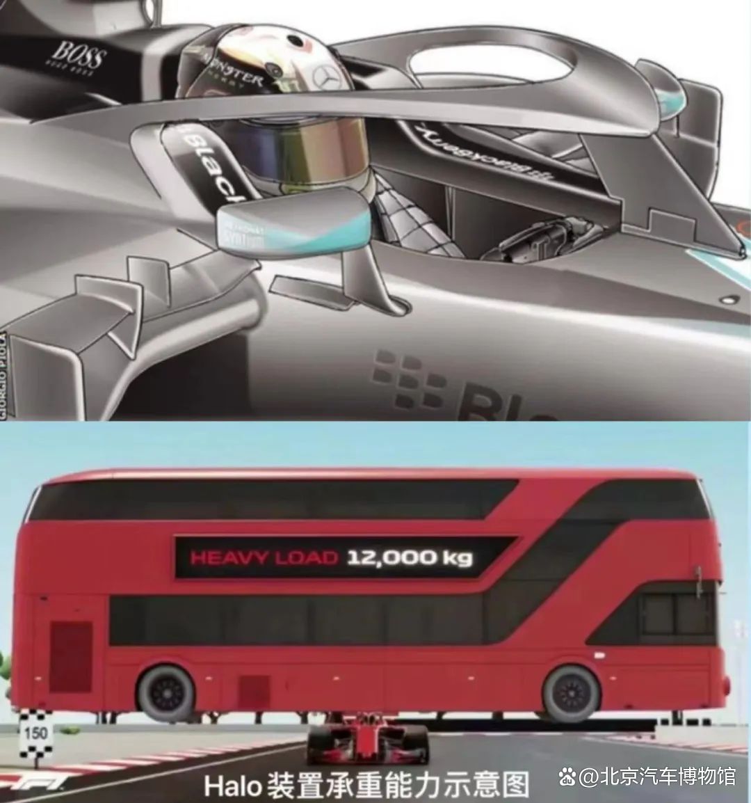 Halo系统是使用钛合金和碳纤维材料打造的防护措施。它环绕在车手头部上方,可以保护车手的头部免造免遭受到赛场内外的诸多质疑,但是在后来的几次事故中Halo系统“力挽狂澜”,避免了数次危险的事故。在FIA的测试中,Halo的最多可以承受12吨左右的重量,这相当于一辆双层巴士的冲击,正是这样严苛的要求才赋予Halo极高的强度,保护车手平安归来。