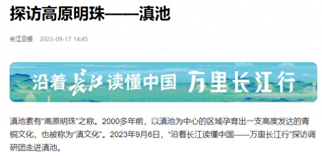 9月17日,长江日报刊登文章《探访高原明珠——滇池》,介绍滇池河长制治理成效,区域内人居环境和生态环境改善成果。