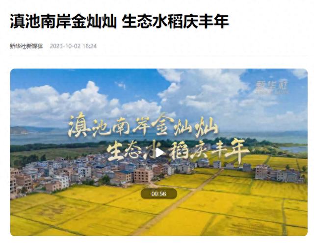 10月2日国庆“黄金周”期间,新华社发布《滇池南岸金灿灿 生态水稻庆丰年》、人民日报客户端发布《大美滇池再上新:蓝天下碧水旁,翻起金色稻浪》视频,共同展现昆明市不断推进滇池“人城湖产”建设,让滇池湖畔乡村有了“稻花香里说丰年”的秋收美景。