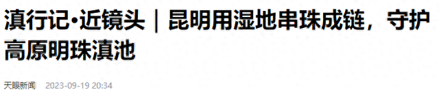 天眼新闻9月19日发布题为《滇行记·近镜头|昆明用湿地串珠成链,守护高原明珠滇池》的文章,关注湿地公园在滇池治理中起到的重要作用,展现“高原明珠”滇池新的光彩。