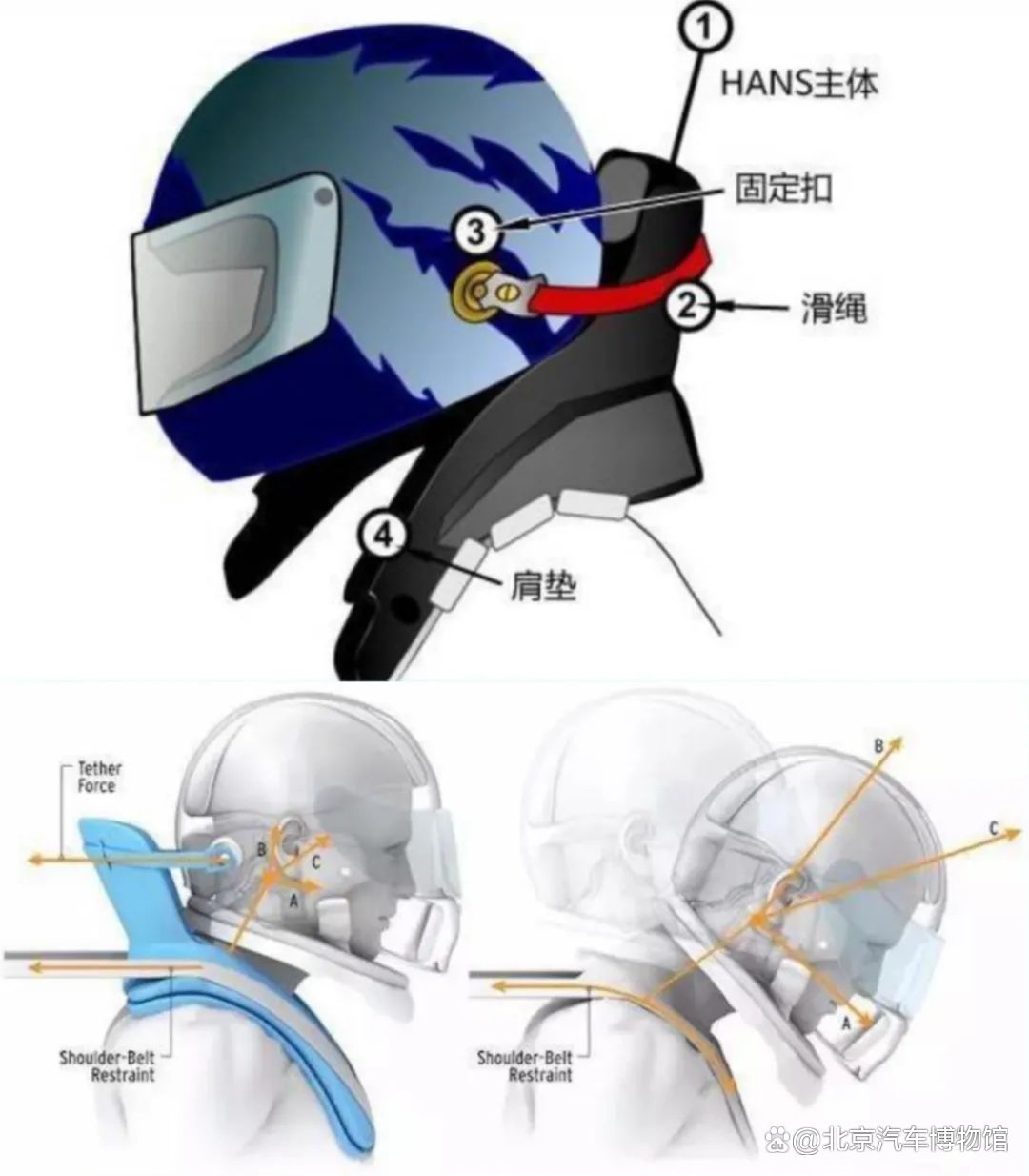 F1赛车可以以超过200公里/小时的平均时速行驶,在发生事故时,速度会在瞬间降至0,随之而来的就是巨大的加速度。面对高速撞击时,在安全带的保护下,车手的身体能被拉住固定在座椅上,但头部还是会猛地向前摆动,此时颈部将承受巨大的冲击力,这时就是HANS系统发挥作用的时刻。HANS通过安全带固定在车手的肩部和胸部,头盔后方是一道小型的隔板,将车手的头盔和头部后方的车身隔离开来,发生撞击时,滑绳将抑制住头部向前摆动的趋势,冲击力也将被从颈椎分散至胸部、躯干、肩膀等处,从而保护赛车手的安全。