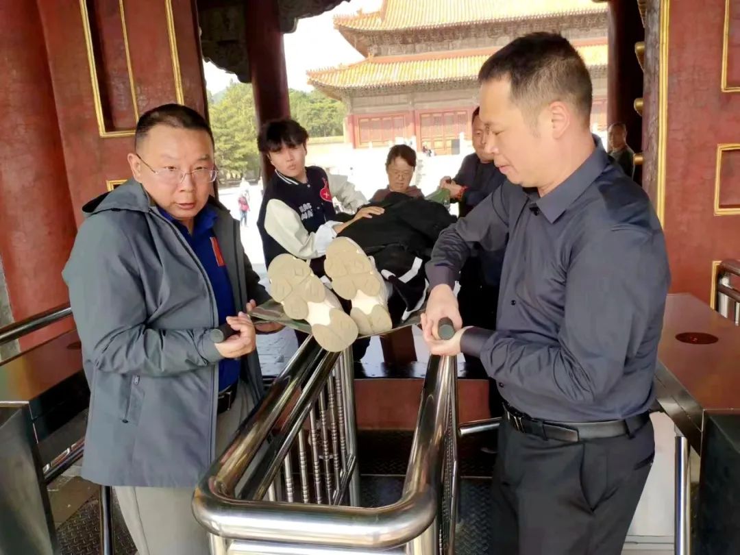 10月3日,在裕陵游览的一名女游客出现呕吐、晕厥症状,随行亲属焦急地向在岗馆员求助。管区主任接到报告后,立即启动应急处置程序,在第一时间奔赴现场的同时联系景区医护室并携带担架等救援设备救助游客。在管区、医护室及游客亲属的共同努力下,利用最短时间将病人运送到医院进行救治,游客表示十分感谢。