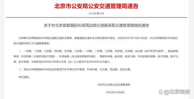 北京市公安局公安交通管理局发布通告,为保障北京首都国际机场周边道路交通安全顺畅,根据道路交通安全法律法规有关规定,决定自2023年10月16日起,对北京首都国际机场周边部分道路采取以下交通管理措施: