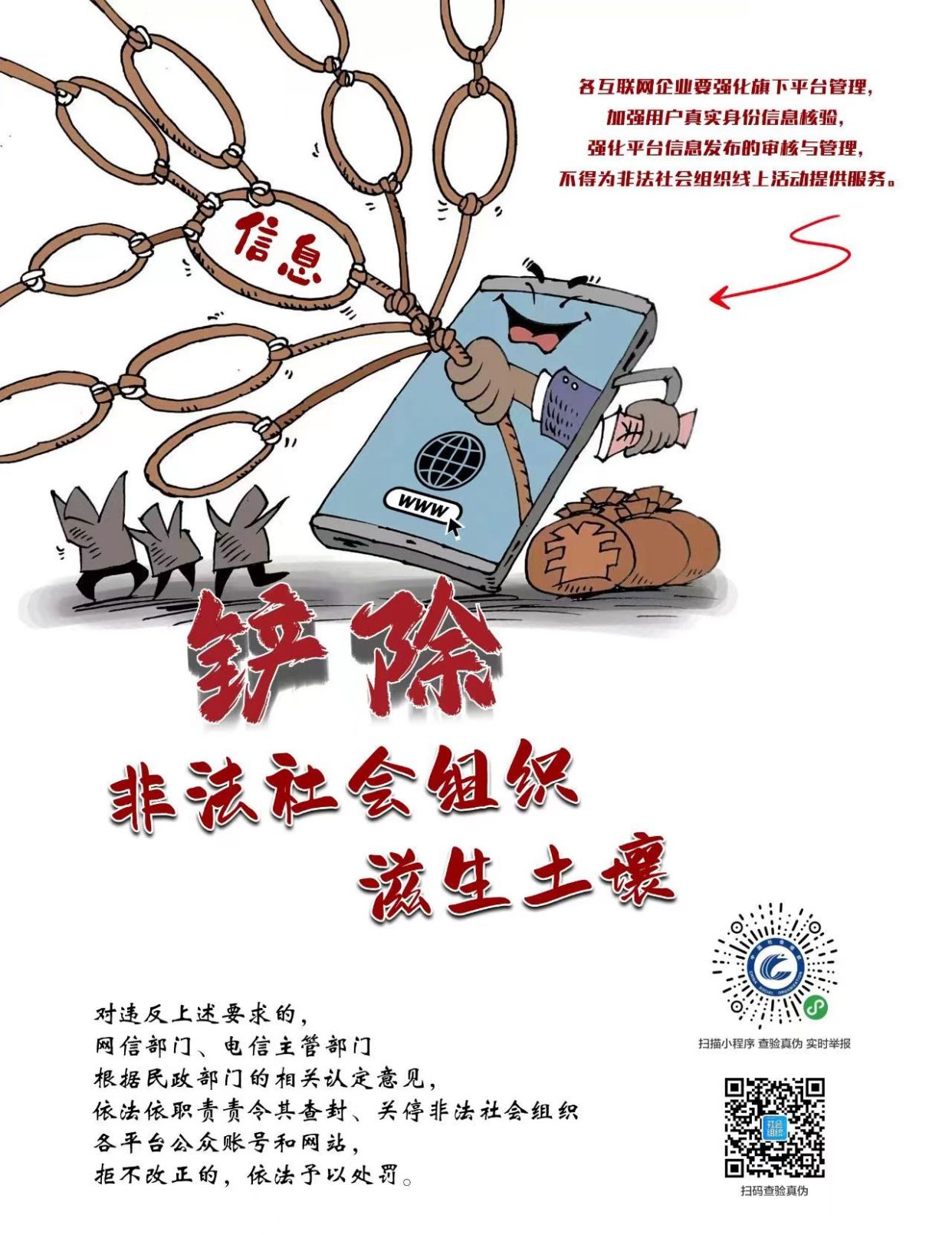 1.企事业单位和社会组织不得与非法社会组织有关联2.党员干部不得参与非法社会组织活动3.新闻媒体不得宣传报道非法社会组织活动4.各种公共服务设施和场所不得为非法社会组织提供便利5.各互联网企业不得为非法社会组织线上活动提供便利6.各金融机构不得为非法社会组织活动提供便利7.进一步提高非法社会组织的违法成本来源:中国社会组织动态