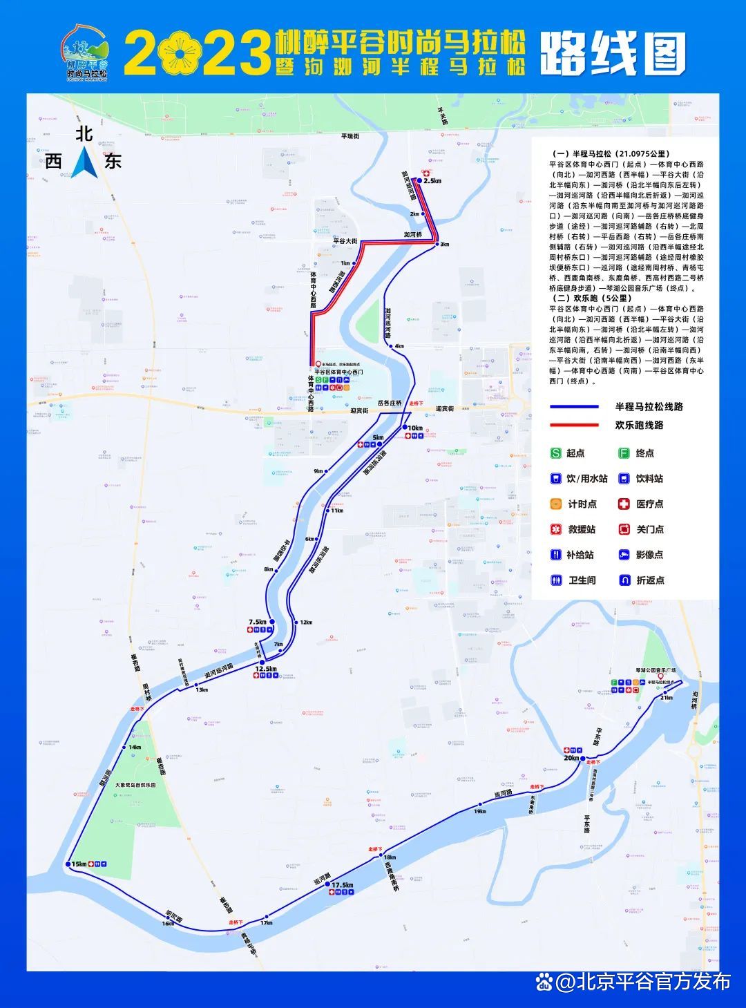 平谷区体育中心西门(起点)—体育中心西路(向北)—洳河西路(西半幅)—平谷大街(沿北半幅向东)—洳河桥(沿北半幅向东后左转)—洳河巡河路(沿西半幅向北后折返)—洳河巡河路(沿东半幅向南至洳河桥与洳河巡河路路口)—洳河巡河路(向南)—岳各庄桥桥底健身步道(途经)—洳河巡河路辅路(右转)—北周村桥(右转)—平岳西路(右转)—岳各庄桥南侧辅路(右转)—洳河巡河路(沿西半幅途经北周村桥东口)—洳河巡河路辅路(途经周村橡胶坝便桥东口)—巡河路(途经南周村桥、青杨屯桥、西鹿角南桥、东鹿角桥、西高村西路二号桥桥底健身步道)—琴湖公园音乐广场(终点)。
