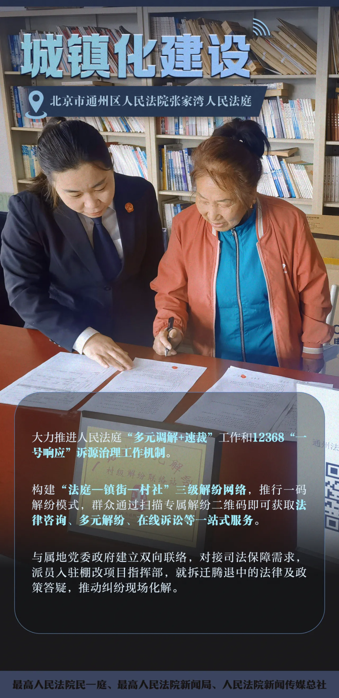 张家湾人民法庭作为最高人民法院确定的服务新型城镇化建设试点法庭,始终以习近平新时代中国特色社会主义思想为指导,坚持把非诉讼纠纷解决机制挺在前面,以实际行动深入践行新时代“枫桥经验”。按照最高人民法院部署,张家湾人民法庭认真落实市高级法院关于“多元调解+速裁”和12368“一号响应”诉源治理工作要求,主动适应新型城镇化示范区建设需求,通过“能动司法止纠纷于前端——向前站位促治理于未病——汇集合力解纠纷于诉前”三环递进“抓前端、治未病”。