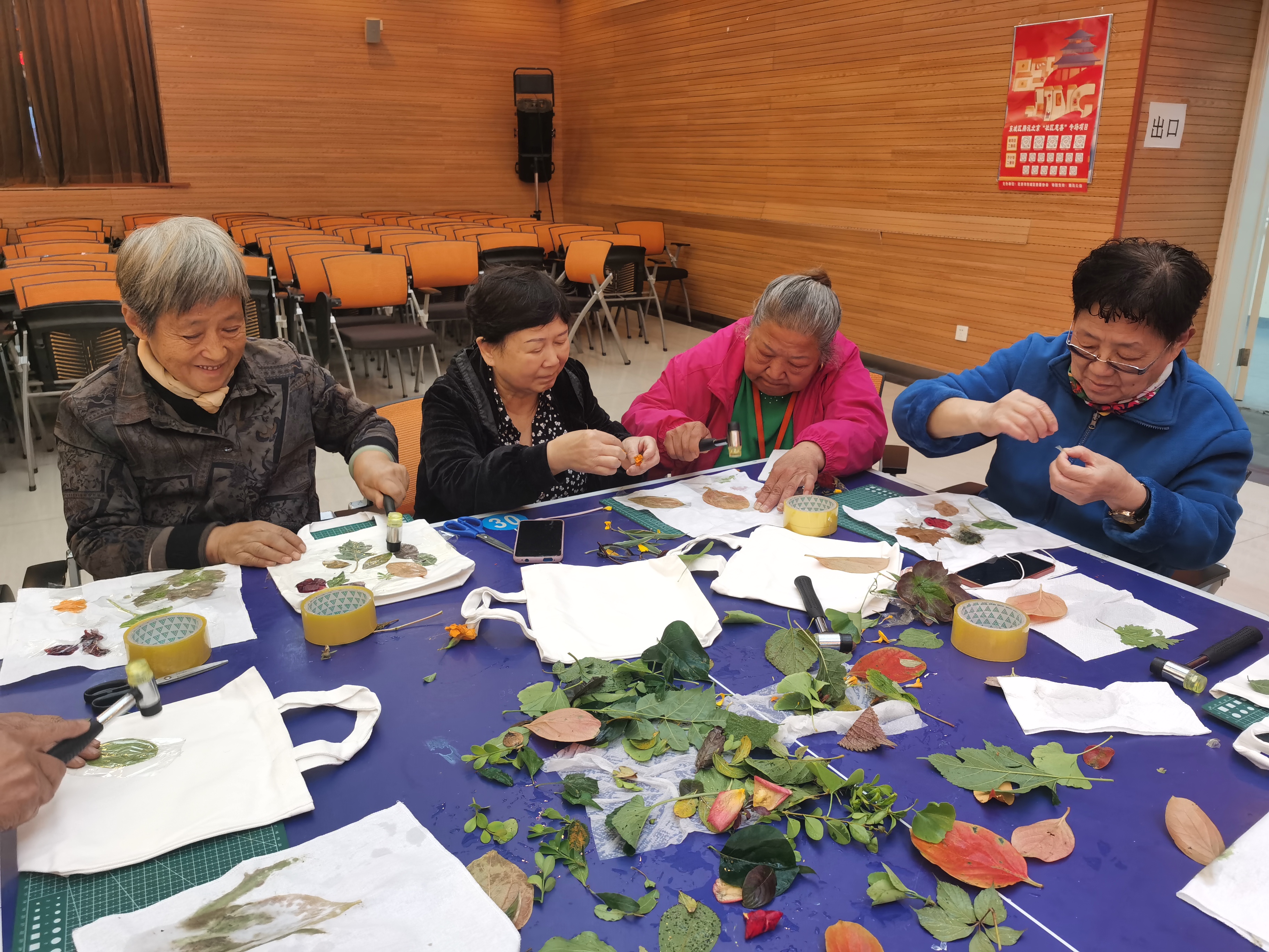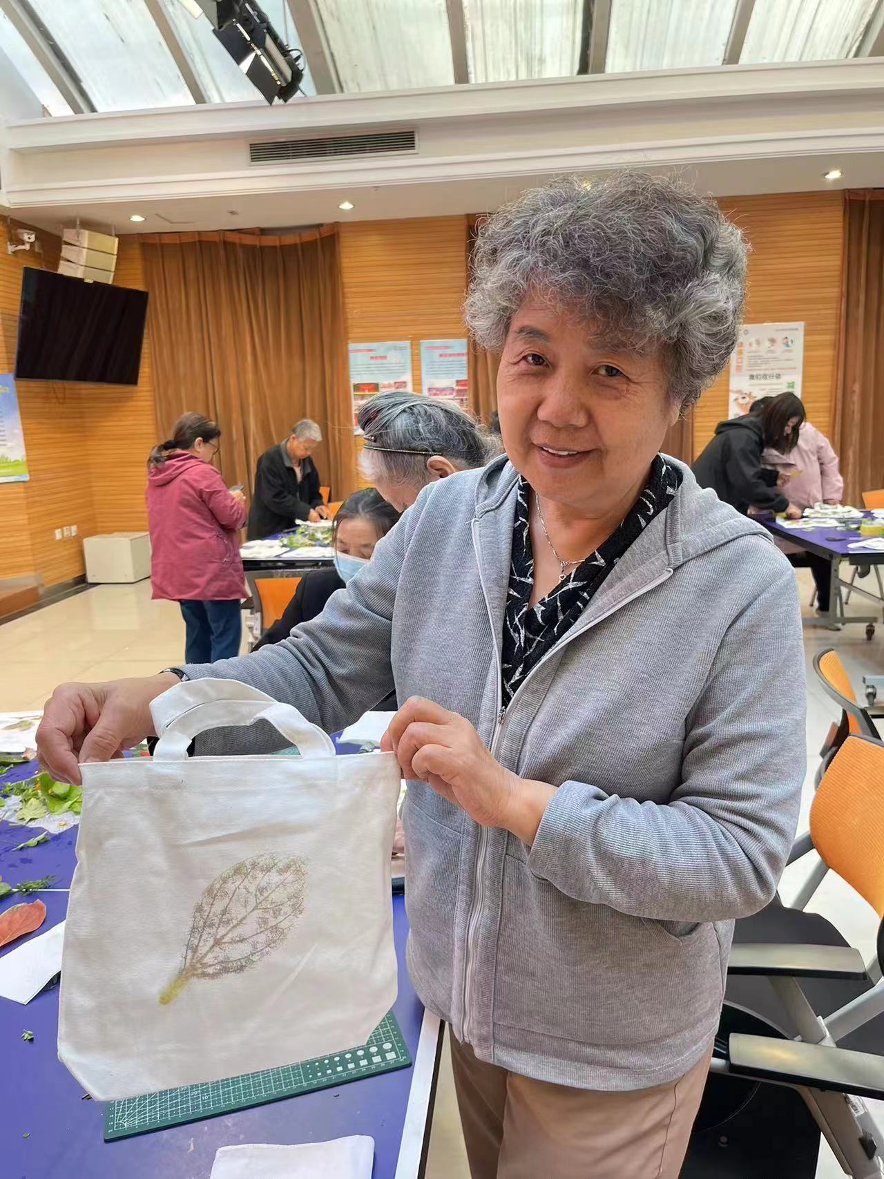 在职党员李虹现场为大家讲解了园艺疗法的理念和方法,节气对情绪的影响,“五感”的体验方式和植物的特点等内容。在实践操作环节,老人们耐心细致的敲打,一个个普通的帆布包顿时有了生命力。在大家的不断调整和尝试下,一件件精美的作品诞生了。