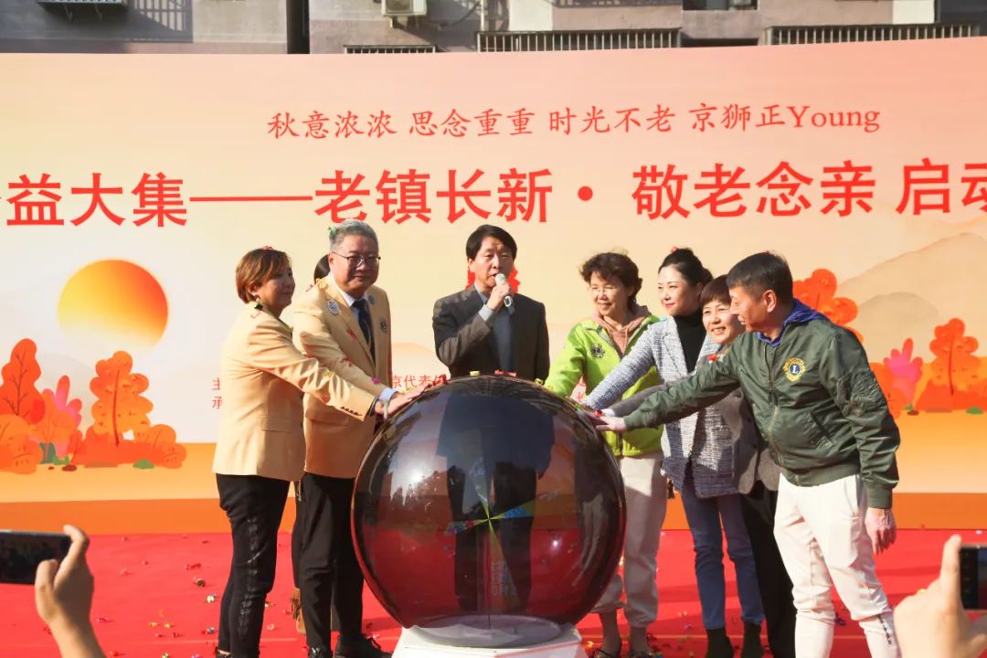 随后在全场的热烈掌声中,李忠书记与狮子联会北京代表处杨晓歌、长馨园社区书记申昊昕共同按下启动球,宣布“老镇常新 孝老爱亲”京狮公益大集活动正式启动。