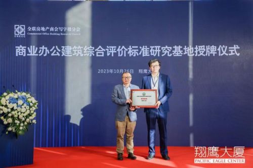 作为京西商务地标级建筑,以及在硬件和软性实力方面的卓越表现,翔鹰大厦被全联房地产商会授予"商业办公建筑综合评价标准研究基地"称号。在本次活动上,全联房地产商会副秘书长刘凯先生为翔鹰大厦授牌。