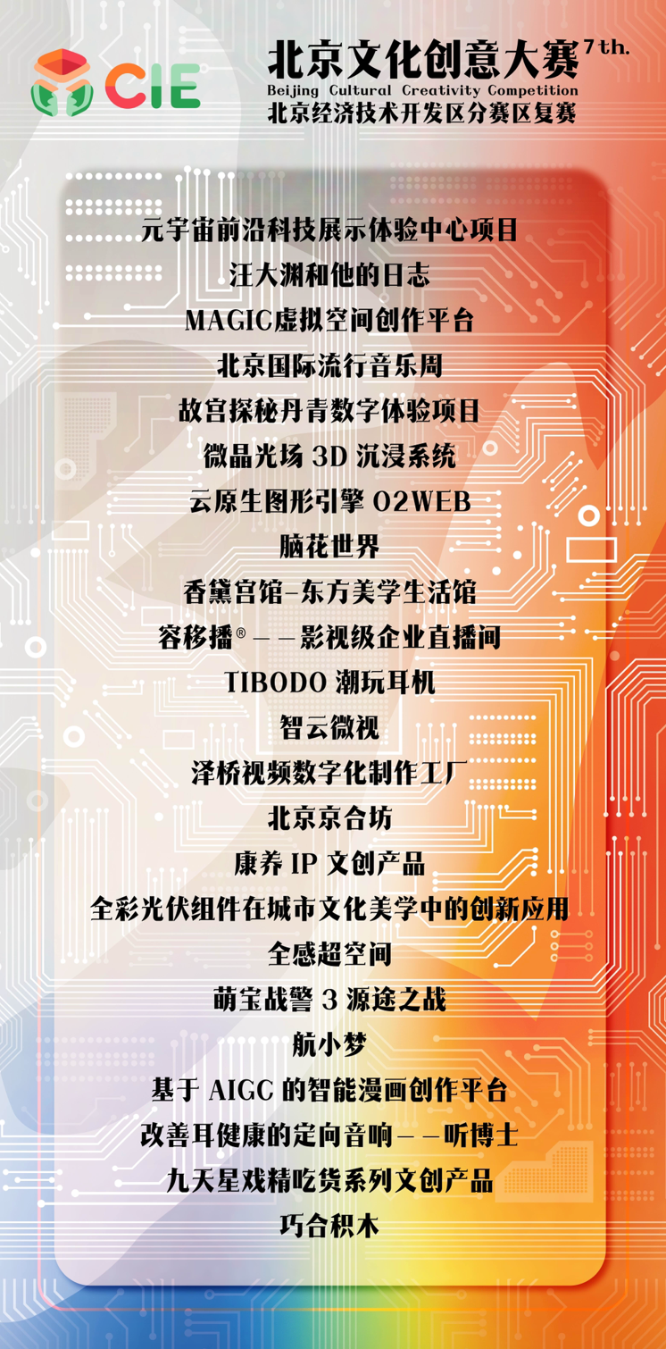 11月2日,由北京市国有文化资产管理中心主办,北京市文化产业促进中心、北京歌华传媒集团有限责任公司支持,北京经济技术开发区工委宣传文化部承办的第七届北京文化创意大赛经开区分赛区复赛在中国(北京)高新视听产业园开启参赛项目的展示,经过复赛现场的激烈角逐,因出现并列排名情况,以下23个优秀项目成功晋级经开区总决赛。