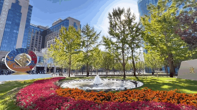 为突出论坛年会主题,我区在金融街中心广场和中心花园东侧设置“金融街论坛”主题logo小品景观,摆放红色一品红、黄色角堇等开花植物,营造勃勃生机和热烈氛围,并通过LED屏幕对大会主题进行综合展示,同时增加以地球为载体的大会logo设计,圆形组合寓意圆转如意,生生不息,放眼全球,聚焦中国。在金科广场,我区打造以扇面为主题的景观小品,寓意礼仪、风度,吉祥如意,传统与现代的结合彰显大国之气。