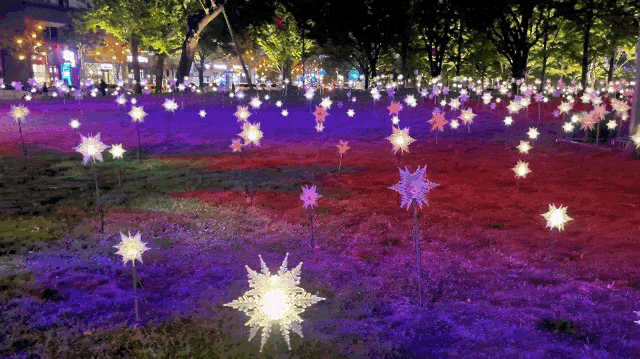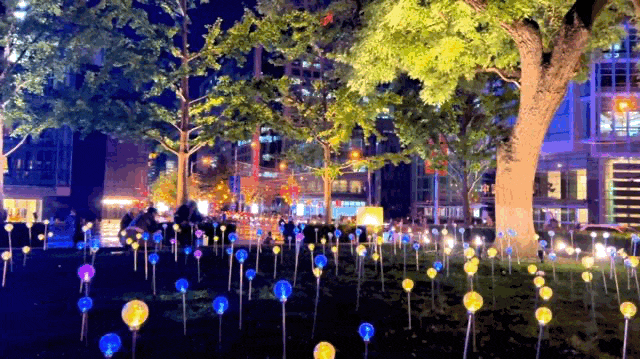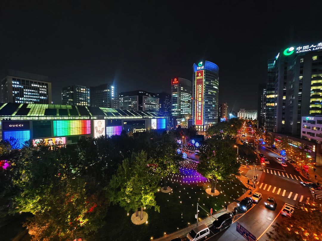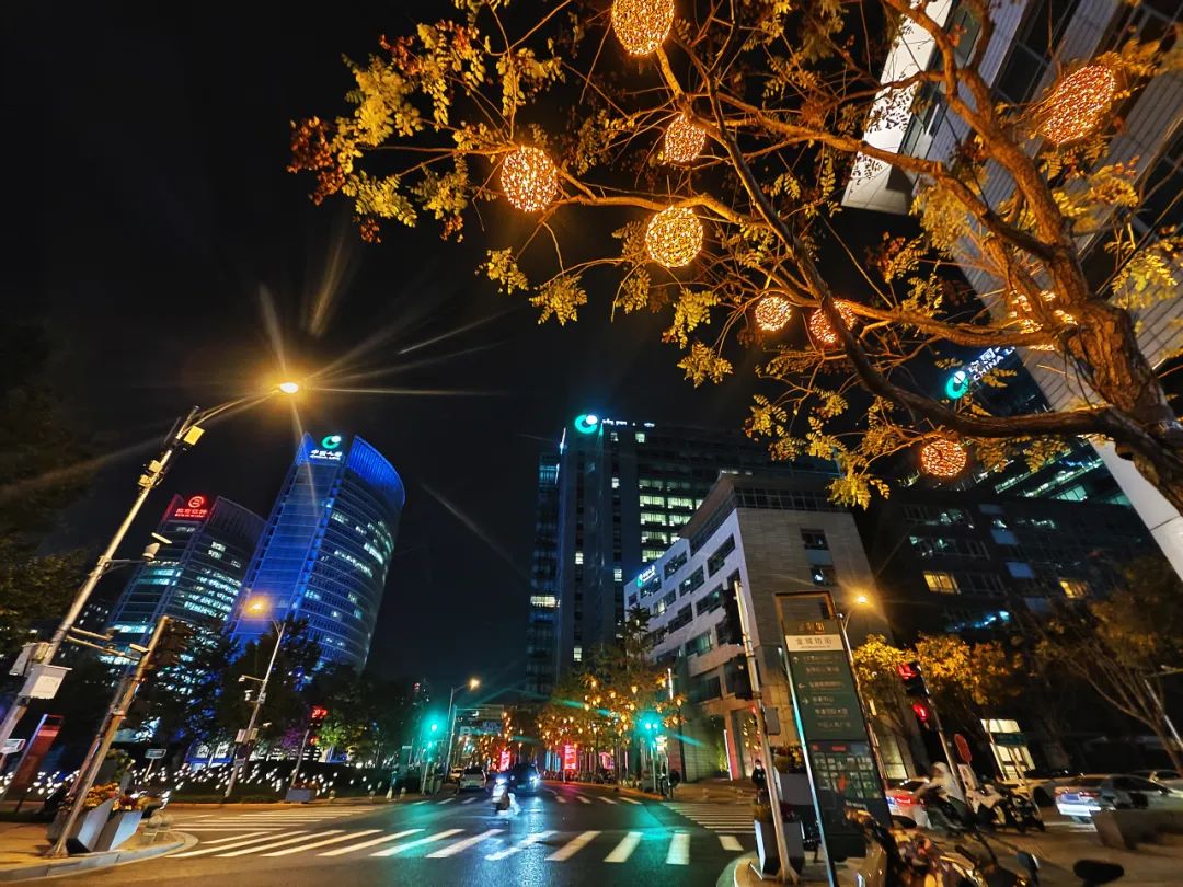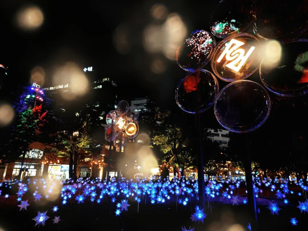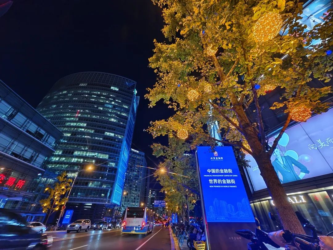 为烘托论坛年会喜庆氛围,我区围绕金融街内部三横一纵、金融街中心广场、金科新区广场、绿地及会场入口等地,对灯光进行了精心布置和设计。在金融街内部三横一纵道路两侧,我区打造以金色为基底,以“藤球灯+星光灯”为组合的灯光布置,金色灯光洒满整条街道,寓意金秋硕果累累;过节灯饰既有寓意联结和流动的金色丝带在飞舞,还有繁星点缀、星光引路的唯美场景。