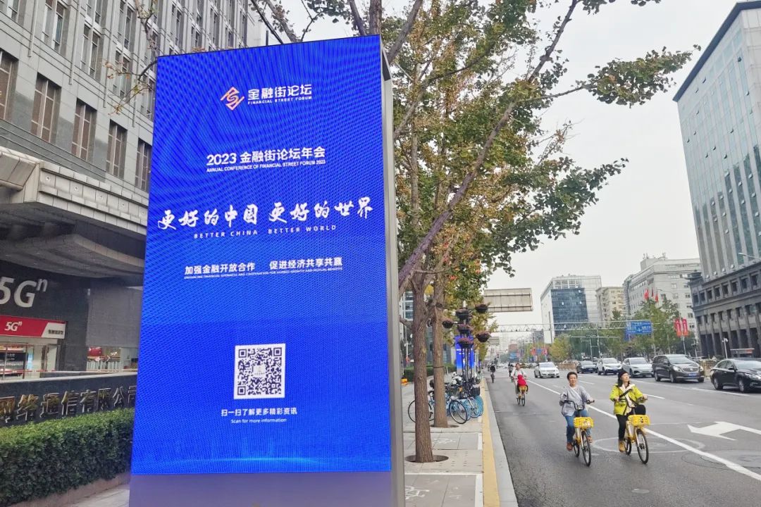 据了解,为让市民能实时收看到论坛动态,金融街购物中心广场大屏分时段对2023金融街论坛年会进行实时直播,除部分会议外,市民均可通过线上平台观看会议直播。我区还将通过君太、老佛爷等商场、北京北站及天桥演艺中心大屏对论坛相关内容进行展示,此外,金融街已处处充满2023金融街论坛年会“元素”,38块户外立地LED显示屏分布在金融街区域,屏幕上显示的是本届论坛的主视觉,吸引着来来往往市民的目光,营造2023金融街论坛年会浓厚氛围。