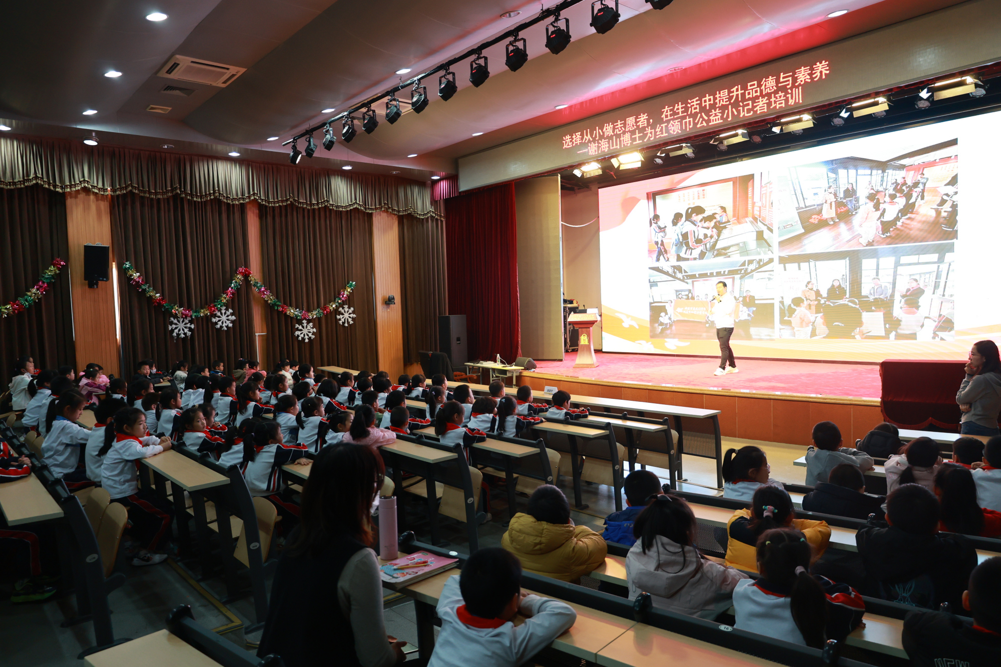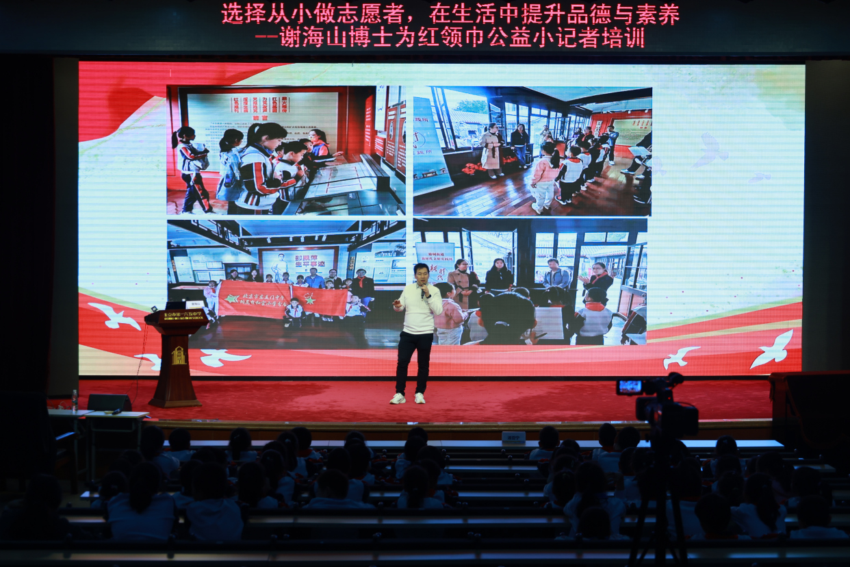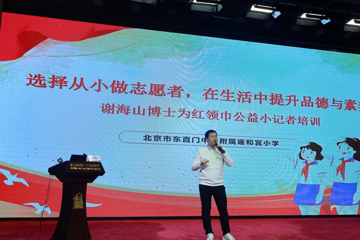 2023年11月6日,雍和宫小学、星光志愿者协会、北京市星光社会工作服务中心在雍和宫小学为几百名红领巾星光公益小记者举行培训大会。本次邀请公益小记者实训营首席专家、第四届中国青年志愿者协会副会长、第十二届全国青联委员、北京市欧美同学会理事谢海山博士为小记者们开讲《选择从小做志愿者,在生活中提升品德与素养》。