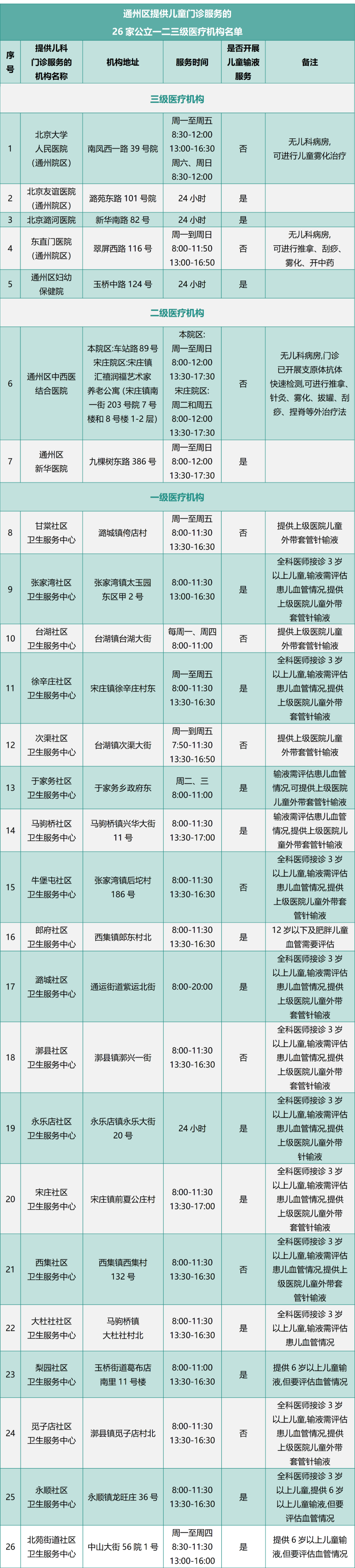 通州区卫健委发布26家提供儿童门诊服务的公立一、二、三级医院名单,方便儿童就近就医。