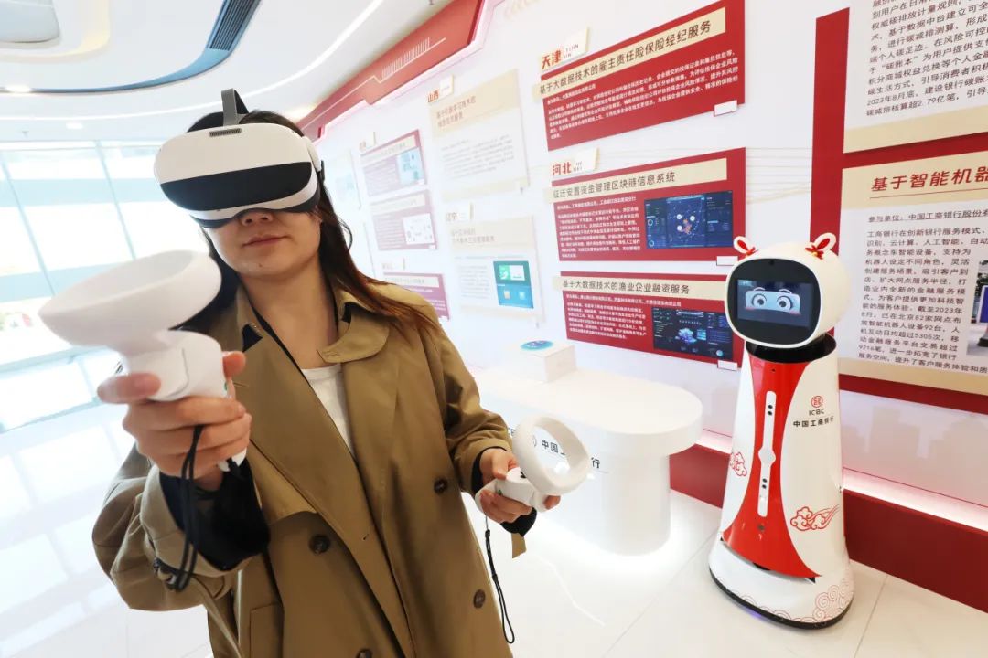 值得一提的是,本次展览引入了VR技术。中国工商银行河北雄安分行以容城支行旗舰网点为原型,通过VR技术一比一建模打造了“VR数字营业厅”。记者实地体验,通过操作手柄在数字营业厅中漫步游览,寻找拼图碎片,进入数字营销沙龙,新奇又有趣。