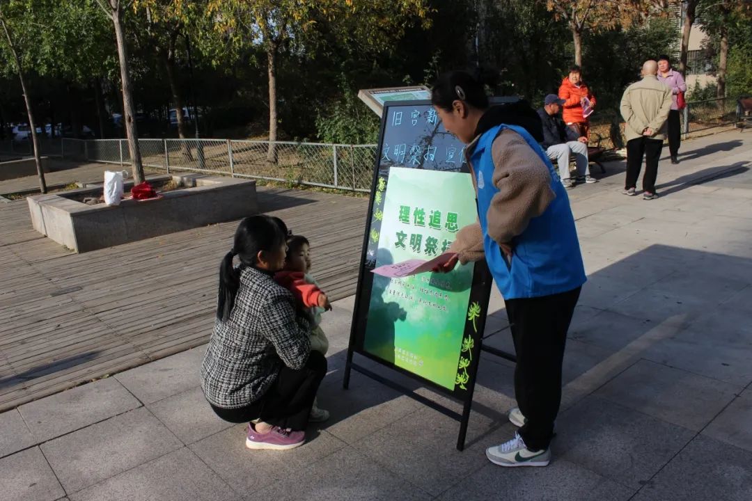 为广泛践行社会主义核心价值观,传播传承中华优秀传统文化,贯彻落实《北京市文明行为促进条例》,进一步减少空气污染、维护公共安全,推进移风易俗、倡导社会新风,创建文明健康、安全环保的宜居环境,旧宫镇依照区委、区政府工作安排,按照“党委领导、部门联动、属地管理、全民参与”的工作原则,紧紧围绕移风易俗、摒弃陋习、文明祭奠的总体目标,多举措推进文明祭扫工作,切实保障公共安全和人民群众生命、财产安全,为广大人民群众营造整洁有序、文明安定、生态宜居的社会环境。