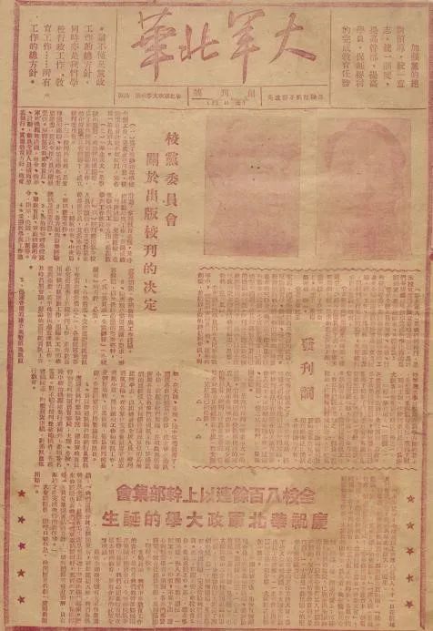 为了推动指导学校全盘工作,完成教学任务,华北军政大学校党委员会决定创办校刊,定名为《华北军大》。1948年6月17日,华北军政大学政治部创办的《华北军大》创刊号出版。该报共有8版,全版红色印刷。报纸的第一版印有毛泽东、朱德的头像。报头刊载办报方针:“加强党的绝对领导、统一意志、统一制度,提高干部、提高学员,保证胜利地完成教育任务。这不仅是党政工作的总方针、同时亦是我们学校行政工作,教育工作……所有工作的总方针。”
