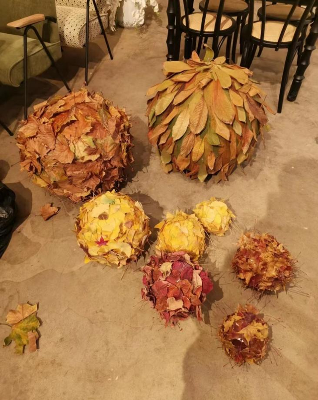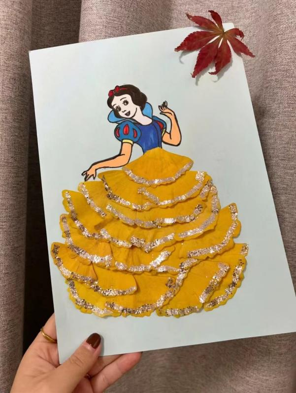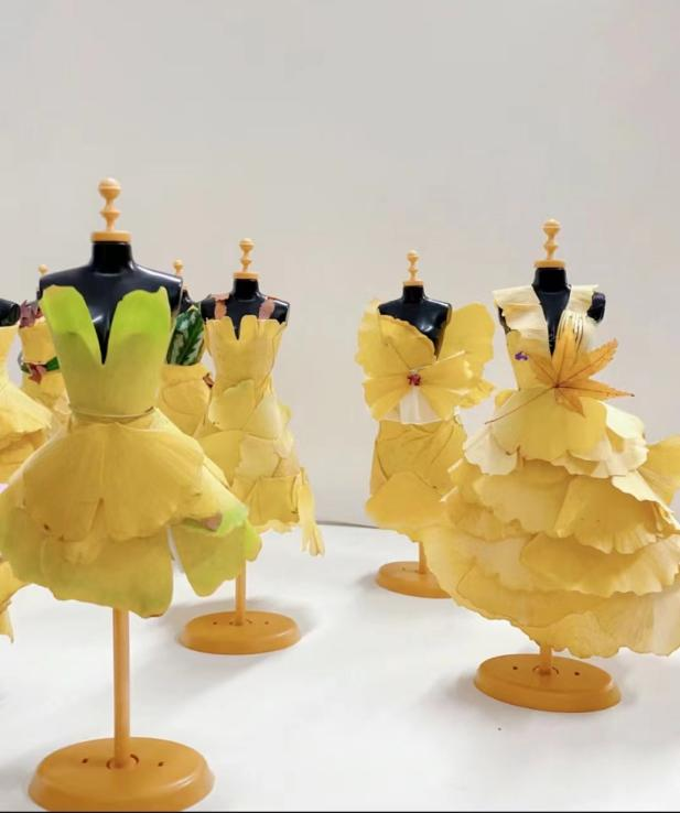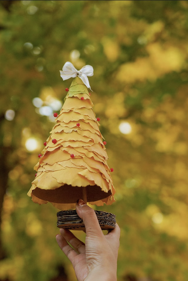 第四步:将树干、贴好银杏的圆锥体和底座组合起来,最后用物品装饰一下。