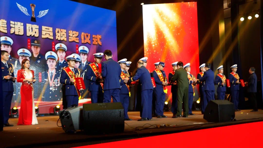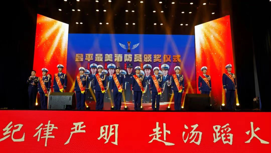 颁奖仪式上,10位“最美消防员”身着“火焰蓝”,口号响亮,步伐坚定,集体登台亮相,佩戴绶带和功勋奖章,集中展示出新时代昌平消防救援指战员的良好形象。